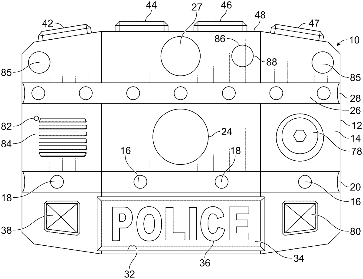 A wearable law enforcement patrol light and signal device including a housing to be worn by a law enforcement patrol officer on a bulletproof vest or on an arm. A high intensity light source is mounted in a front plate of the housing, the high intensity light source electrically connected to a source of electric power in the housing. A switch activates and deactivates the high intensity light source, or the high intensity light source may automatically deactivate. The high intensity light source emits an alternating burst of light of at least five thousand lumens outward when the high intensity light source is activated. The housing of the device also supports a plurality of warning lights, identification badging, a communication system, and other features in a single housing that a patrol officer would normally wear as independent elements.