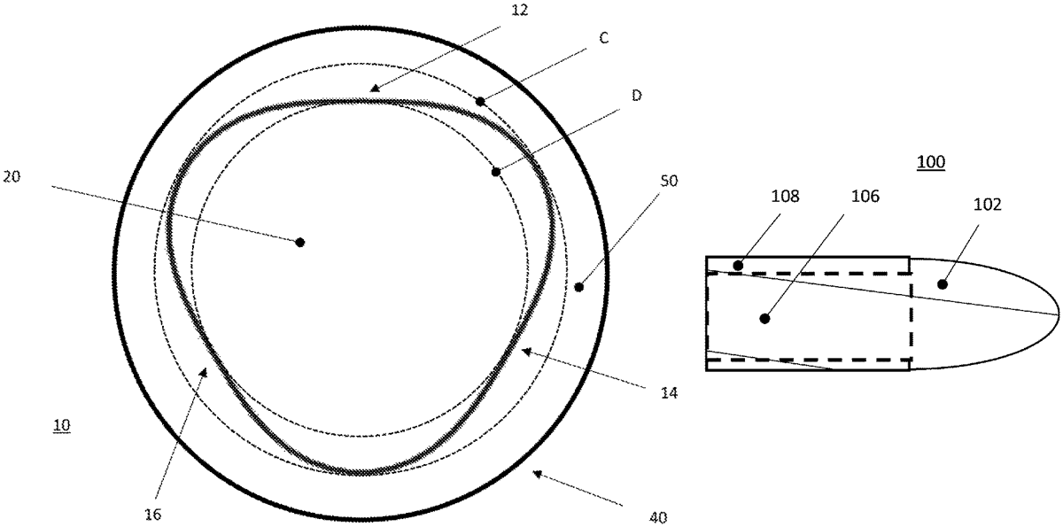 A projectile for launching from a launching device with a propellant charge in a barrel is arranged with a cross-section in the shape of a curve of constant width.