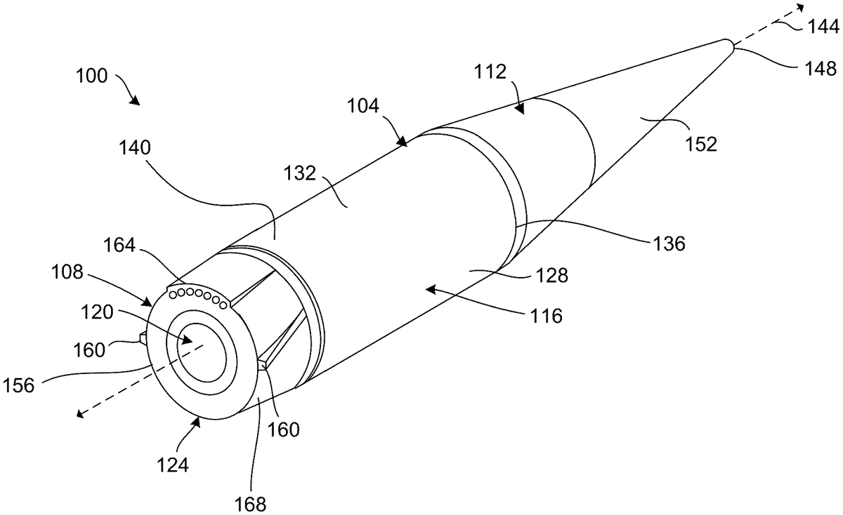 - A body spin detection device for a rotating chassis and despun collar portion, the device comprising: a chassis extending axially from a tail portion to a nose portion, the chassis defining a generally cylindrical wall and further defining a collar support portion extending axially from the tail portion; a despun collar portion rotationally mounted on the collar support portion, the despun collar portion separated axially from the chassis for free despinning of the despun collar portion relative to the chassis about a central axis, the despun collar portion separated by a gap between a first face of the despun collar portion and an opposing annular shoulder of the chassis; a detection element mounted in one of the first face and the opposing annular shoulder; and a perturbing element mounted in the other of the first face and the opposing annular shoulder, the perturbing element and the detection element positioned opposing one another such that the despun collar portion and chassis having a plurality of rotational orientations, relative to one another about the central axis, including a first rotational orientation where the perturbing element and the detection element are rotationally aligned and a second rotational orientation where the perturbing element and the detection element are rotationally non-aligned; and detection circuitry electrically coupled with the detection element, the detection circuitry including a processor and a computer readable storage medium, the computer readable storage medium including a set of instructions executable by the processor to cause the detection circuitry to: transmit, via the detection element, an electrical signal in an axial direction towards the perturbing element and the other of the first face and the opposing annular shoulder; receive, via the detection element, a first input signal, the first input signal being a reflected portion of the transmitted electrical signal reflected via the perturbing element; determine a first set of signal characteristics for the first input signal; receive, via the detection element, a second input signal, the second input signal being a reflected portion of the transmitted electrical signal reflected via the other of the first face and the opposing annular shoulder not including the perturbing element; determine a second set of signal characteristics for the second input signal; and determine, by comparing the first set of signal characteristics to the second set of signal characteristics, that the first input signal is different from the second input signal. a chassis extending axially from a tail portion to a nose portion, the chassis defining a generally cylindrical wall and further defining a collar support portion extending axially from the tail portion; a despun collar portion rotationally mounted on the collar support portion, the despun collar portion separated axially from the chassis for free despinning of the despun collar portion relative to the chassis about a central axis, the despun collar portion separated by a gap between a first face of the despun collar portion and an opposing annular shoulder of the chassis; a detection element mounted in one of the first face and the opposing annular shoulder; and a perturbing element mounted in the other of the first face and the opposing annular shoulder, the perturbing element and the detection element positioned opposing one another such that the despun collar portion and chassis having a plurality of rotational orientations, relative to one another about the central axis, including a first rotational orientation where the perturbing element and the detection element are rotationally aligned and a second rotational orientation where the perturbing element and the detection element are rotationally non-aligned; and detection circuitry electrically coupled with the detection element, the detection circuitry including a processor and a computer readable storage medium, the computer readable storage medium including a set of instructions executable by the processor to cause the detection circuitry to: transmit, via the detection element, an electrical signal in an axial direction towards the perturbing element and the other of the first face and the opposing annular shoulder; receive, via the detection element, a first input signal, the first input signal being a reflected portion of the transmitted electrical signal reflected via the perturbing element; determine a first set of signal characteristics for the first input signal; receive, via the detection element, a second input signal, the second input signal being a reflected portion of the transmitted electrical signal reflected via the other of the first face and the opposing annular shoulder not including the perturbing element; determine a second set of signal characteristics for the second input signal; and determine, by comparing the first set of signal characteristics to the second set of signal characteristics, that the first input signal is different from the second input signal. transmit, via the detection element, an electrical signal in an axial direction towards the perturbing element and the other of the first face and the opposing annular shoulder; receive, via the detection element, a first input signal, the first input signal being a reflected portion of the transmitted electrical signal reflected via the perturbing element; determine a first set of signal characteristics for the first input signal; receive, via the detection element, a second input signal, the second input signal being a reflected portion of the transmitted electrical signal reflected via the other of the first face and the opposing annular shoulder not including the perturbing element; determine a second set of signal characteristics for the second input signal; and determine, by comparing the first set of signal characteristics to the second set of signal characteristics, that the first input signal is different 