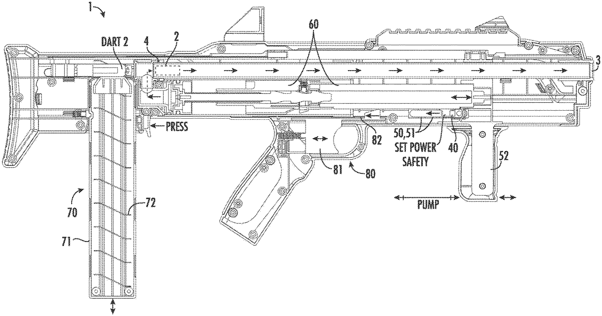 The patent describes a variable safety output control system for a pneumatic toy dart projector that allows for adjustable power control while enhancing safety for juvenile users. It features a manual dual-sided pressure adjustment mechanism that limits the pneumatic pump’s power stroke, ensuring adult-level adjustments while minimizing the risk for children.