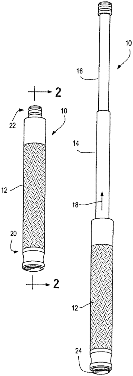 The patent describes an extendable baton featuring a locking mechanism that includes a clutch plate and a control rod, allowing for secure extension and retraction. The design incorporates a release button and a spring to facilitate the locking and unlocking process, enhancing the baton’s usability and safety.