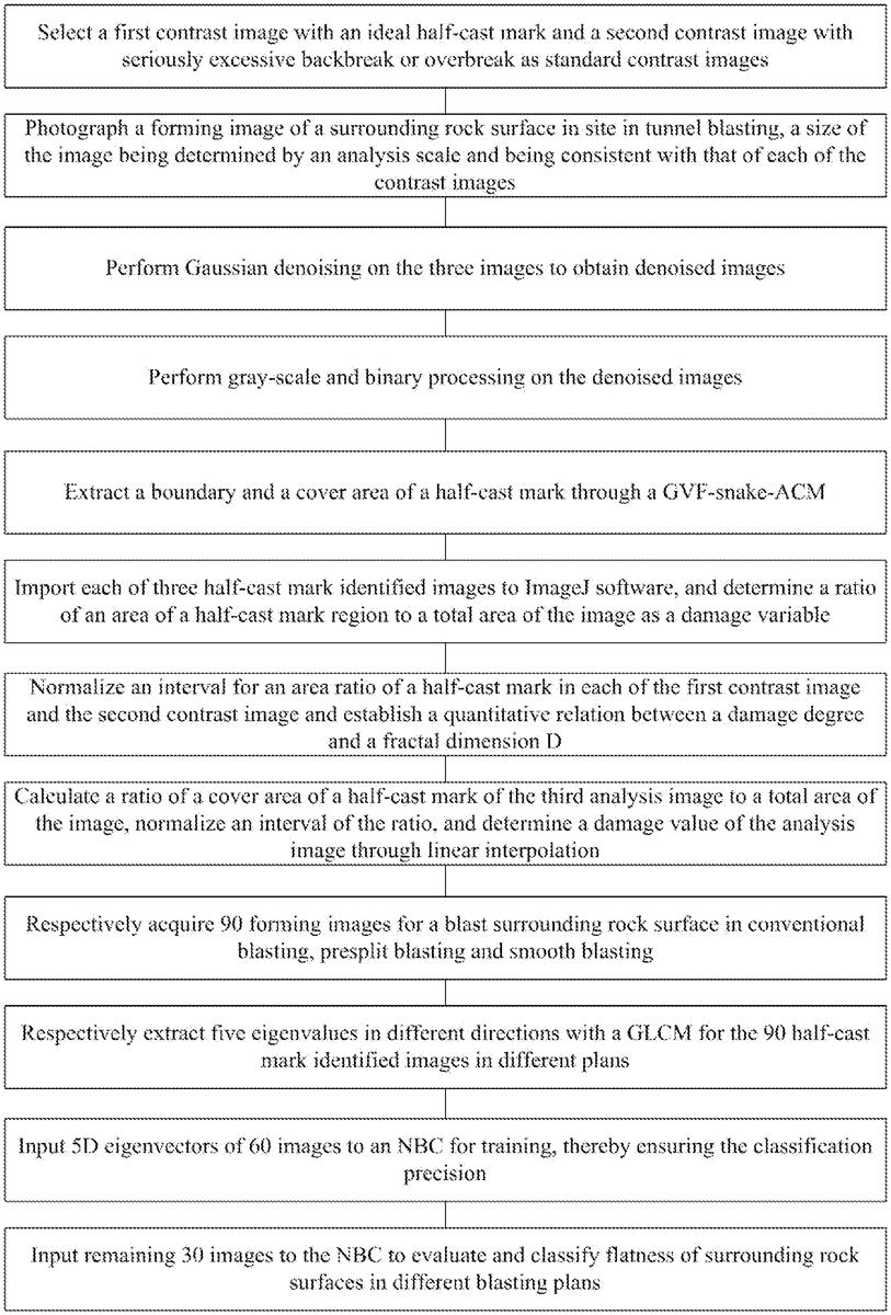 The patent describes a method for identifying half-cast marks and evaluating damage in tunnel blasting through a series of image processing steps, including denoising, gray-scale processing, and binary processing. It employs a naive Bayes classifier to classify the blasting effects and assess the flatness of surrounding rock surfaces based on extracted multi-dimensional digital features from the images.
