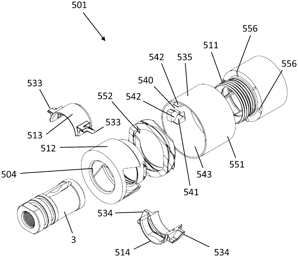 - A connector assembly for connecting a firearm accessory to a muzzle device for a firearm, the connector assembly comprising: a first connector part, and a second connector part engaged to the first connector part by a threaded engagement, the first connector part presenting a first engagement surface, at least two clamp members configured to receive the muzzle device therebetween, the clamp members coupled to the second connector part to be axially and rotationally retained thereto, each of the clamp members presenting a second engagement surface to engage the first engagement surface, and wherein rotation of the first connector part relative to the second connector part in a first direction moves the first connector part from a first relative axial position to a second relative axial position to engage the first engagement surface against the second engagement surfaces to drive the clamp members radially inwards against the muzzle device in an inward radial position to clamp the muzzle device and connect the firearm accessory to the firearm, wherein the connector assembly further comprises a mechanism to drive the clamp members from the inward radial position to an outward radial position when the first connector part is in or moved to the first relative axial position to allow a muzzle device to be received in or removed from the connector assembly, wherein the mechanism comprises a cam component configured to engage an outer surface of the second connector part and to move longitudinally with respect to the first and second connector parts, and wherein the cam component does not rotate relative to the second connector component. a first connector part, and a second connector part engaged to the first connector part by a threaded engagement, the first connector part presenting a first engagement surface, at least two clamp members configured to receive the muzzle device therebetween, the clamp members coupled to the second connector part to be axially and rotationally retained thereto, each of the clamp members presenting a second engagement surface to engage the first engagement surface, and wherein rotation of the first connector part relative to the second connector part in a first direction moves the first connector part from a first relative axial position to a second relative axial position to engage the first engagement surface against the second engagement surfaces to drive the clamp members radially inwards against the muzzle device in an inward radial position to clamp the muzzle device and connect the firearm accessory to the firearm, wherein the connector assembly further comprises a mechanism to drive the clamp members from the inward radial position to an outward radial position when the first connector part is in or moved to the first relative axial position to allow a muzzle device to be received in or removed from the connector assembly, wherein the mechanism comprises a cam component configured to engage an outer surface of the second connector part and to move longitudinally with respect to the first and second connector parts, and wherein the cam component does not rotate relative to the second connector component.