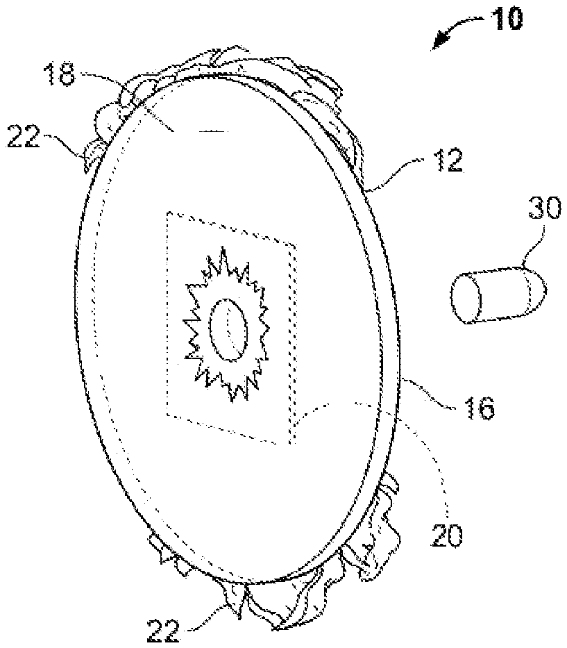 - A target shooting training device marker to be affixed to an existing projectile impact target comprising: a semi-rigid support having a forward side and a back side, wherein said forward side is of a color or pattern that is indistinguishable from said existing projectile impact target to which it is affixed and wherein said back side has an adhesive or adhesive tape affixed thereon for attaching one or more said target shooting training device markers to an existing projectile impact target, said adhesive or adhesive tape having a protective coating and a replaceable flexible cover of a thickness able to be stretched over said semi-rigid support and of a color that is easily observed by the user at a distance from said existing projectile impact target containing one or more target shooting training device markers such that when said flexible material cover is penetrated by a projectile said flexible material cover tears away from said semi-rigid support exposing said forward side of said target shooting training device marker having the same color or pattern of said existing projectile impact target causing said target shooting training device marker to disappear when viewed at a distance away from said existing projectile impact training said replaceable flexible cover being spherical in shape with a circular opening having a rim, said rim having a thickness greater than said thickness of said replaceable flexible cover. a semi-rigid support having a forward side and a back side, wherein said forward side is of a color or pattern that is indistinguishable from said existing projectile impact target to which it is affixed and wherein said back side has an adhesive or adhesive tape affixed thereon for attaching one or more said target shooting training device markers to an existing projectile impact target, said adhesive or adhesive tape having a protective coating and a replaceable flexible cover of a thickness able to be stretched over said semi-rigid support and of a color that is easily observed by the user at a distance from said existing projectile impact target containing one or more target shooting training device markers such that when said flexible material cover is penetrated by a projectile said flexible material cover tears away from said semi-rigid support exposing said forward side of said target shooting training device marker having the same color or pattern of said existing projectile impact target causing said target shooting training device marker to disappear when viewed at a distance away from said existing projectile impact training said replaceable flexible cover being spherical in shape with a circular opening having a rim, said rim having a thickness greater than said thickness of said replaceable flexible cover.