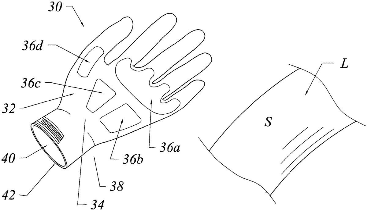 The patent describes a glove designed to deliver pulsed electric currents to a user’s skin, temporarily disrupting muscular control for purposes such as subduing a suspect. It features multiple electrodes, a voltage source, and a microprocessor-controlled system to manage the electric output without penetrating clothing or metal.