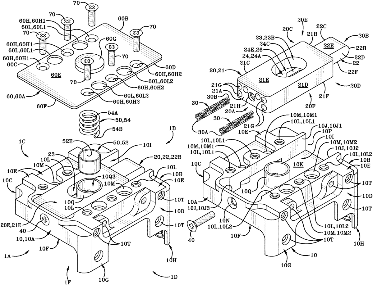 The patent describes a switch assembly designed to engage with a battery, featuring a slide that moves in one direction between primed and released positions, and a firing pin mechanism that operates in a different direction. This assembly includes a support with a cavity and projection to facilitate the interaction between the slide and firing pin mechanism.