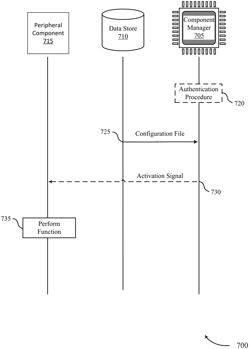 The patent describes a method for dynamically managing peripheral components of a firearm, such as status indicators, based on user authentication and configuration files. It includes processes for receiving user input to modify settings, detecting when a user picks up the gun, and illuminating the status indicator accordingly.