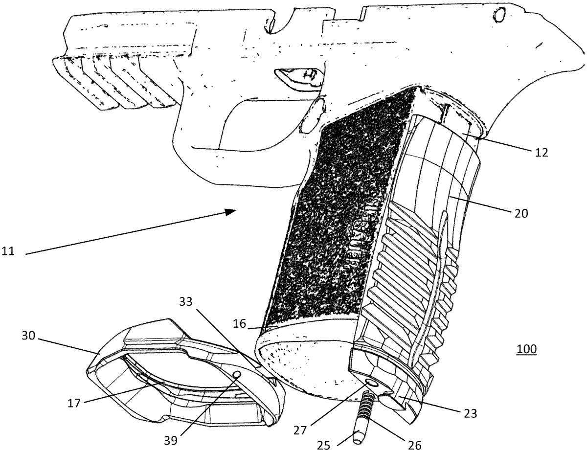 The patent describes a grip attachment for firearms that features a threadless region allowing for slidable coupling to a grip, enabling restricted fore/aft movement. Additionally, it incorporates a spring-biased interface to maintain the attachment’s position relative to the grip while allowing movement along a non-parallel axis.