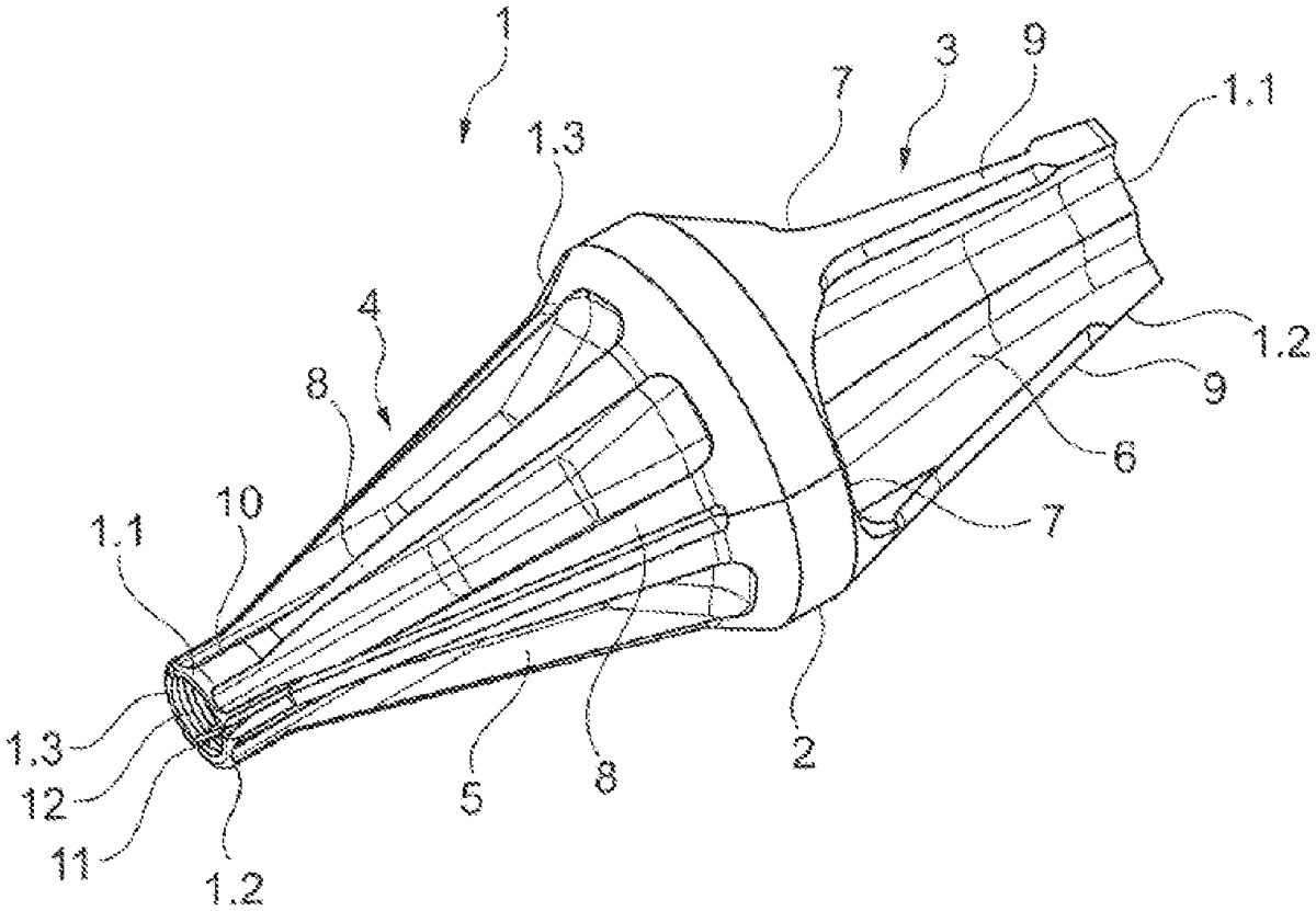 - A sabot having a push-pull function, comprising: a plurality of sabot segments adjacent in a circumferential direction, each of the plurality of sabot segments comprising: a front push-part; a rear pull-part; a pressure flange between the front push-part and the rear pull-part; a front end arranged in a shooting direction of the sabot; a rear end arranged opposite to the shooting direction, wherein the sabot and the plurality of sabot segments has a structural design at the rear end such that the sabot has a low flexural resistance, wherein the sabot has a cylindrical-shaped portion at the rear end such that the plurality of sabot segments are configured to roll during detachment, wherein the rear pull-part has a first proximal end proximal to the pressure flange and a second distal end distal from the pressure flange, the second distal end of the rear pull-part being disposed at the rear end of the sabot, the second distal end of the rear pull-part having a thinner wall thickness than the first proximal end of the rear pull-part, the second distal end of the rear pull-part having the thinner wall thickness forming the cylindrical-shaped portion, wherein the rear pull-part and the front push-part have recesses, the recesses extending along the rear pull-part from the pressure flange toward the rear end of the sabot and the recesses extending along the front push-part from the pressure flange toward the front end, which are open radially outwards, within the sabot segments, the recesses being delimited in the circumferential direction by struts extending in the shooting direction between the rear end and the pressure flange and between the front end and the pressure flange. a plurality of sabot segments adjacent in a circumferential direction, each of the plurality of sabot segments comprising: a front push-part; a rear pull-part; a pressure flange between the front push-part and the rear pull-part; a front end arranged in a shooting direction of the sabot; a rear end arranged opposite to the shooting direction, wherein the sabot and the plurality of sabot segments has a structural design at the rear end such that the sabot has a low flexural resistance, wherein the sabot has a cylindrical-shaped portion at the rear end such that the plurality of sabot segments are configured to roll during detachment, wherein the rear pull-part has a first proximal end proximal to the pressure flange and a second distal end distal from the pressure flange, the second distal end of the rear pull-part being disposed at the rear end of the sabot, the second distal end of the rear pull-part having a thinner wall thickness than the first proximal end of the rear pull-part, the second distal end of the rear pull-part having the thinner wall thickness forming the cylindrical-shaped portion, wherein the rear pull-part and the front push-part have recesses, the recesses extending along the rear pull-part from the pressure flange toward the rear end of the sabot and the recesses extending along the front push-part from the pressure flange toward the front end, which are open radially outwards, within the sabot segments, the recesses being delimited in the circumferential direction by struts extending in the shooting direction between the rear end and the pressure flange and between the front end and the pressure flange.