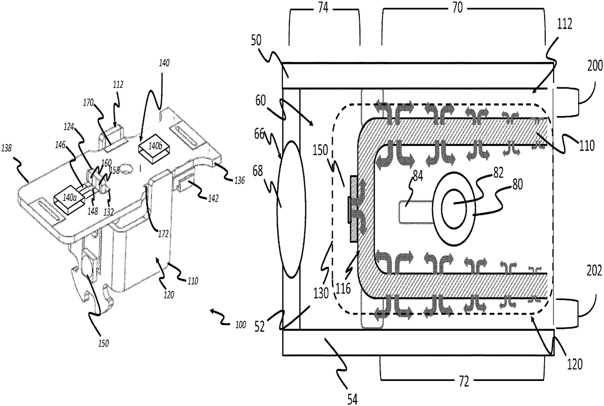 The patent describes a deterrent device attachment that incorporates a light-emitting thermal source and a support board designed to manage heat dissipation effectively. The assembly features a drive circuit that allows for controlled energization of the light source while minimizing heat transfer to the housing.
