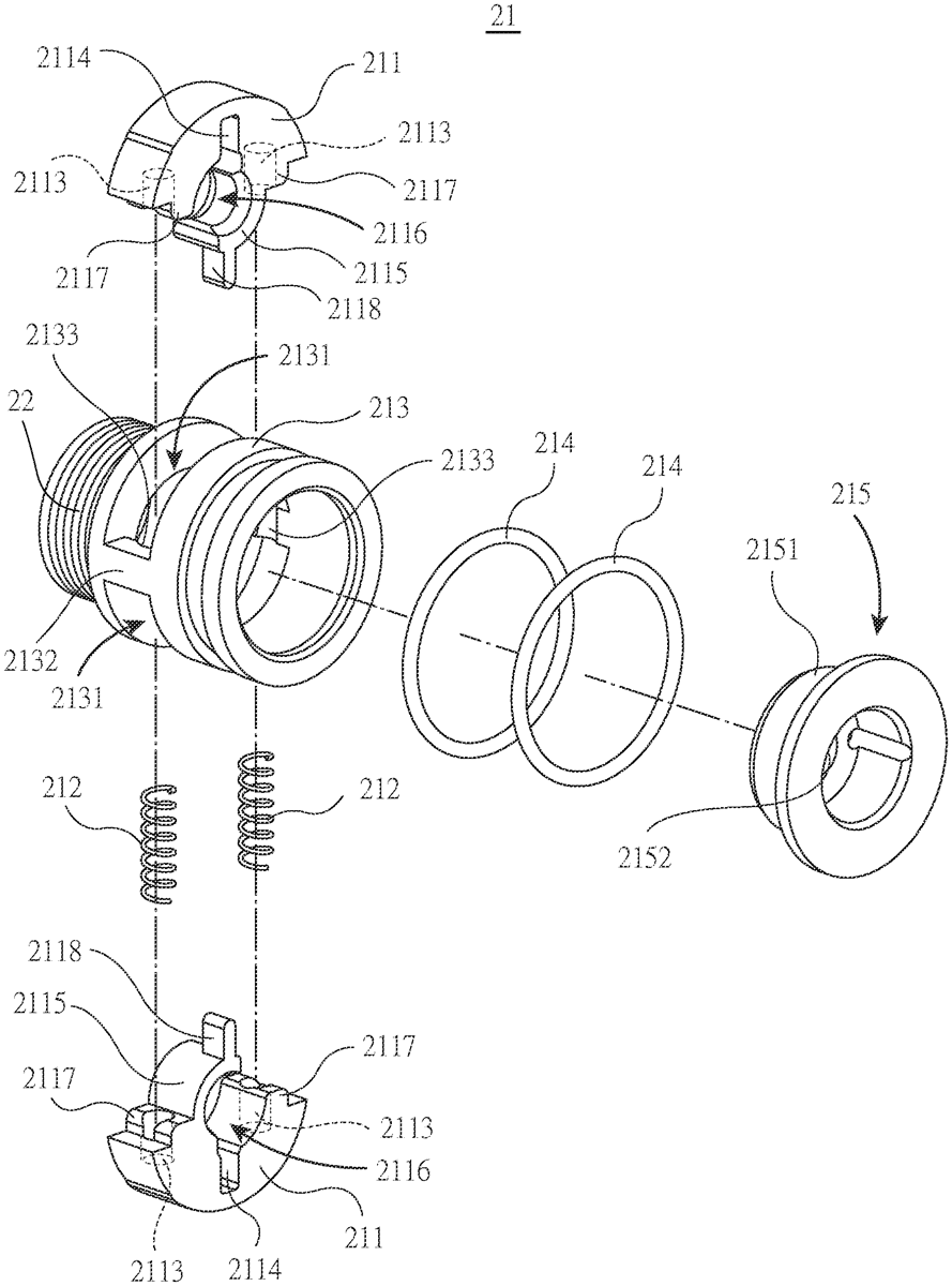 - An expandable baton, comprising: a first tube including internal threads on an inner surface of a second end; a first inner support tube having a diameter less than that of the first tube, the first inner support tube including first external threads on an outer surface, the first external threads being secured to the internal threads of the first tube; a second inner support tube having a diameter less than that of the first tube, the second inner support tube including second external threads on an outer surface, the second external threads being secured to the internal threads of the first tube, the second inner support tube spaced from the first inner support tube with a first annular groove formed between them; a second tube having a diameter less than an inner diameter of the second inner support tube; a second lock mechanism disposed at a first end of the second tube and including two second lock protuberances, two second elastic members and a second externally threaded connection wherein the second externally threaded connection includes a second shoulder adjacent to the second lock protuberances, the inner diameter of the second inner support tube is less than an outer diameter of the second shoulder, the outer diameter of the second shoulder is less than an inner diameter of the first inner support tube, the second externally threaded connection is disposed in the first end of the second tube and the second shoulder urges against the first end of the second tube, a distance between each of the second lock protuberances and the second shoulder is equal to a length of the first annular groove, the second lock mechanism is moveably secured to the first annular groove, and the second tube is moveably disposed in the first tube; a first lock mechanism at the first end of the first tube, the first lock mechanism including two first lock protuberances, two first elastic members and a first externally threaded connection, the first externally threaded connection including a first shoulder adjacent to the first lock protuberances, the first externally threaded connection being disposed in the first end of the first tube and the first shoulder urges against the first end of the first tube, and the first tube being moveably disposed in a third tube; and a second annular groove formed on an inner surface of the third tube wherein a distance between each of the first lock protuberances and the first shoulder is equal to a length of the second annular groove, and the first lock mechanism is moveably secured to the second annular groove; a release mechanism including an axially moveable lock needle having a pointed second end and a housing at a first end, a pushbutton correspondently secured to the housing and projecting out of the first tube, and a spring disposed between the pushbutton and the housing; and a positioning member secured to the third tube for limiting the release mechanism at a first end of the third tube; a pressing of the pushbutton moves the lock needle to insert into the first and second lock mechanism, the first and second lock protuberances depart from the first and second annular groove and urge the first and second elastic members to an unlocked position; without a pressing of the pushbutton, the restored elastic members enable the first and second lock protuberances to return to the first and second annular groove to a locked position. a first tube including internal threads on an inner surface of a second end; a first inner support tube having a diameter less than that of the first tube, the first inner support tube including first external threads on an outer surface, the first external threads being secured to the internal threads of the first tube; a second inner support tube having a diameter less than that of the first tube, the second inner support tube including second external threads on an outer surface, the second external threads being secured to the internal threads of the first tube, the second inner support tube spaced from the first inner support tube with a first annular groove formed between them; a second tube having a diameter less than an inner diameter of the second inner support tube; a second lock mechanism disposed at a first end of the second tube and including two second lock protuberances, two second elastic members and a second externally threaded connection wherein the second externally threaded connection includes a second shoulder adjacent to the second lock protuberances, the inner diameter of the second inner support tube is less than an outer diameter of the second shoulder, the outer diameter of the second shoulder is less than an inner diameter of the first inner support tube, the second externally threaded connection is disposed in the first end of the second tube and the second shoulder urges against the first end of the second tube, a distance between each of the second lock protuberances and the second shoulder is equal to a length of the first annular groove, the second lock mechanism is moveably secured to the first annular groove, and the second tube is moveably disposed in the first tube; a first lock mechanism at the first end of the first tube, the first lock mechanism including two first lock protuberances, two first elastic members and a first externally threaded connection, the first externally threaded connection including a first shoulder adjacent to the first lock protuberances, the first externally threaded connection being disposed in the first end of the first tube and the first shoulder urges against the first end of the first tube, and the first tube being moveably disposed in a third tube; and a second annular groove formed on an inner surface of the third tube wherein a distance between each of the first lock protuberances and the first shoulder is equal to a length of the second annular groove, and the first lock mechanism is moveably secured to the second annular groove; a release mechanism including an a