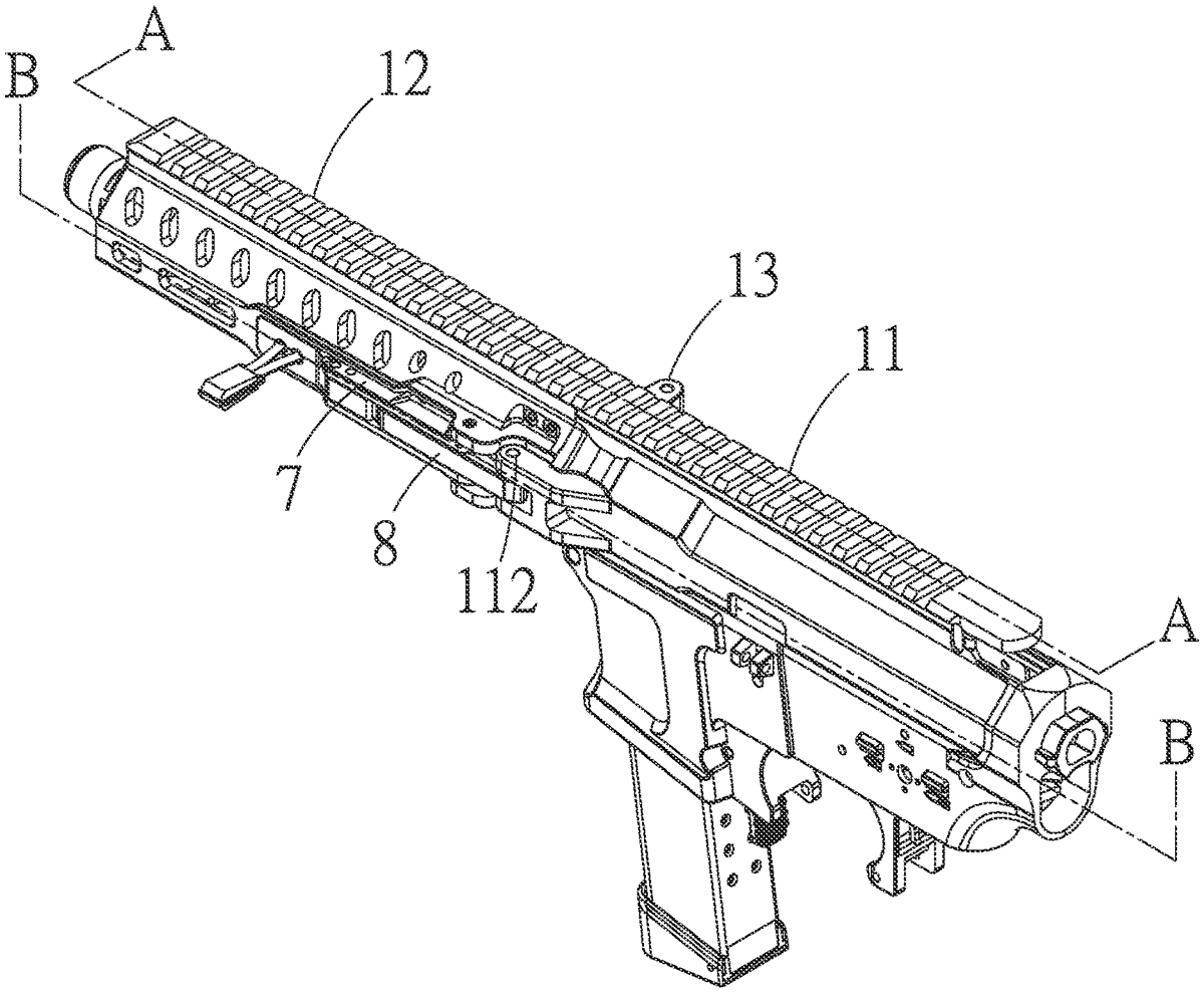 - A folding structure of a toy gun, mainly comprising: a gun body section; a guard section, which is pivotally mounted to one side of the gun body section by a rotation axle portion; a gun barrel portion, which is movably arranged in interiors of the gun body section and the guard section; an internal bore module, which is arranged at an end of the gun barrel portion; an elastic element, which is fit over the gun barrel portion and has two ends respectively mounted to the interior of the guard section and the internal bore module; a bore latch, which is pivotally mounted in the interior of the guard section and correspondingly connected to the internal bore module to fix the internal bore module; a bullet loading latch, which is pivotally mounted in the interior of the gun body section and collaborates with a magazine to control the connection between the bore latch and the internal bore module and controls communication of the internal bore module with the magazine; at least one bore driving member, which is arranged on at least one side of a front end of the internal bore module; at least one driving pull handle, which is pivotally mounted to the guard section for pushing the bore driving member to pull the internal bore module frontward; and a fixing pull handle, which is pivotally mounted to the guard section to fix the guard section by means of a fixing member mounted to the gun body section. a gun body section; a guard section, which is pivotally mounted to one side of the gun body section by a rotation axle portion; a gun barrel portion, which is movably arranged in interiors of the gun body section and the guard section; an internal bore module, which is arranged at an end of the gun barrel portion; an elastic element, which is fit over the gun barrel portion and has two ends respectively mounted to the interior of the guard section and the internal bore module; a bore latch, which is pivotally mounted in the interior of the guard section and correspondingly connected to the internal bore module to fix the internal bore module; a bullet loading latch, which is pivotally mounted in the interior of the gun body section and collaborates with a magazine to control the connection between the bore latch and the internal bore module and controls communication of the internal bore module with the magazine; at least one bore driving member, which is arranged on at least one side of a front end of the internal bore module; at least one driving pull handle, which is pivotally mounted to the guard section for pushing the bore driving member to pull the internal bore module frontward; and a fixing pull handle, which is pivotally mounted to the guard section to fix the guard section by means of a fixing member mounted to the gun body section.
