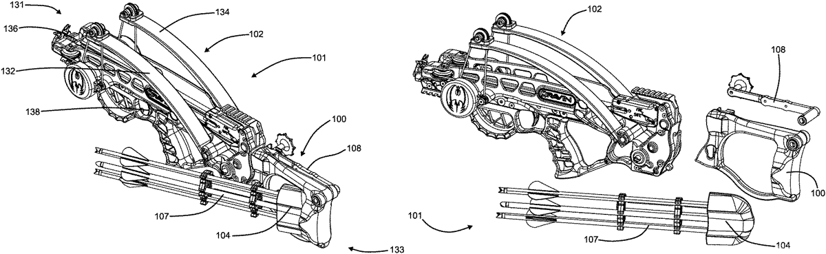 The patent describes a removable stock for a crossbow that features a body with a front end designed to connect to the crossbow’s rear interface and a mounting feature for attaching a projectile. This innovative design allows for easy customization and interchangeability of components in crossbow setups.