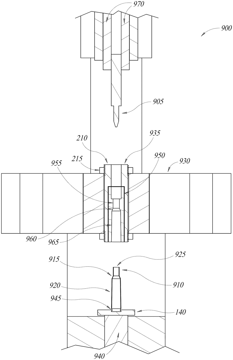 - A method to modify a projectile casing, the method comprising: securing a projectile casing on a base; inserting a mandrel in a die, wherein the die includes a section to shape a neck section of the projectile casing; while the mandrel is inserted into the die, inserting the projectile casing into the die, wherein inserting the projectile casing into the die includes moving the projectile casing towards the die while the die is secured to a support structure; and after the projectile casing has been inserted into the die, extracting the mandrel away from the projectile casing and away from the die, wherein extracting the mandrel away from the projectile casing includes moving the mandrel away from a base section of the projectile casing towards a hole of the projectile casing until the mandrel is completely outside of the projectile casing while the die is secured to the support structure. securing a projectile casing on a base; inserting a mandrel in a die, wherein the die includes a section to shape a neck section of the projectile casing; while the mandrel is inserted into the die, inserting the projectile casing into the die, wherein inserting the projectile casing into the die includes moving the projectile casing towards the die while the die is secured to a support structure; and after the projectile casing has been inserted into the die, extracting the mandrel away from the projectile casing and away from the die, wherein extracting the mandrel away from the projectile casing includes moving the mandrel away from a base section of the projectile casing towards a hole of the projectile casing until the mandrel is completely outside of the projectile casing while the die is secured to the support structure.
