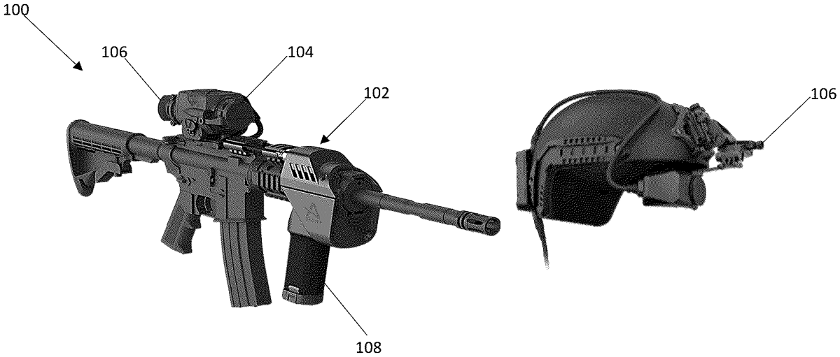 The patent describes a modular combat system that integrates a display, imaging sensor, and a detachable foregrip with programmable interface elements for firearms. This system allows operators to perform ballistic estimations and process captured scenes, presenting the results on the display based on user instructions.