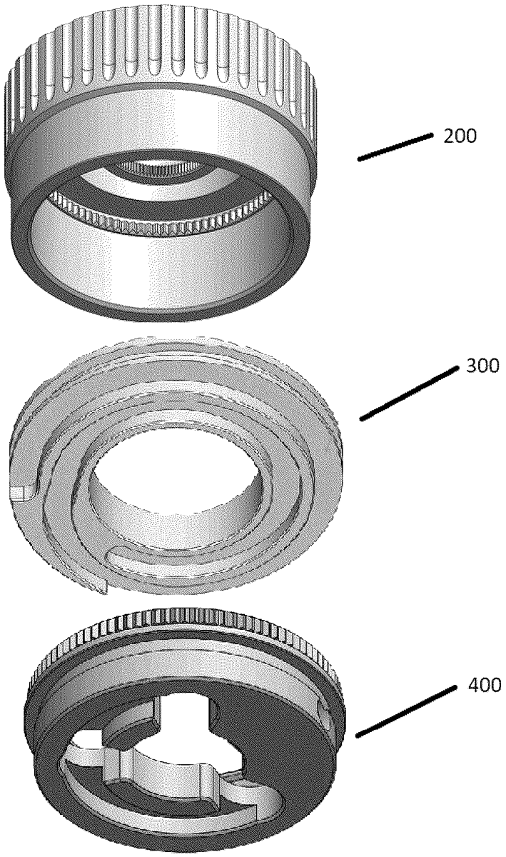 The patent describes a turret mechanism featuring a cam pin chassis, a stop ring with a spiral groove, and a turret cap, all aligned along a common rotational axis. This design allows for precise control of the turret’s rotational limits through engagement between the cam pin and the spiral groove, ensuring reliable positioning.