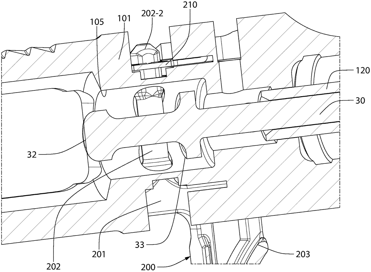 The patent describes a semi-automatic firearm featuring a side-mounted charging handle that allows manual cycling of the bolt carrier assembly between closed and open breech positions. The design includes a mounting pin that secures the firing pin within the bolt carrier, preventing its withdrawal during operation.