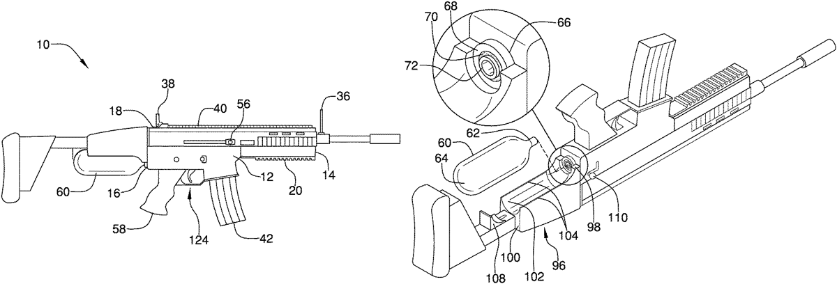 The patent describes an air rifle device that utilizes a carbon dioxide canister as a propellant, featuring a housing with a chamber, a barrel, and a removable clip for projectiles. The design includes a trigger mechanism to expel the propellant into the barrel, facilitating the propulsion of projectiles outwardly.