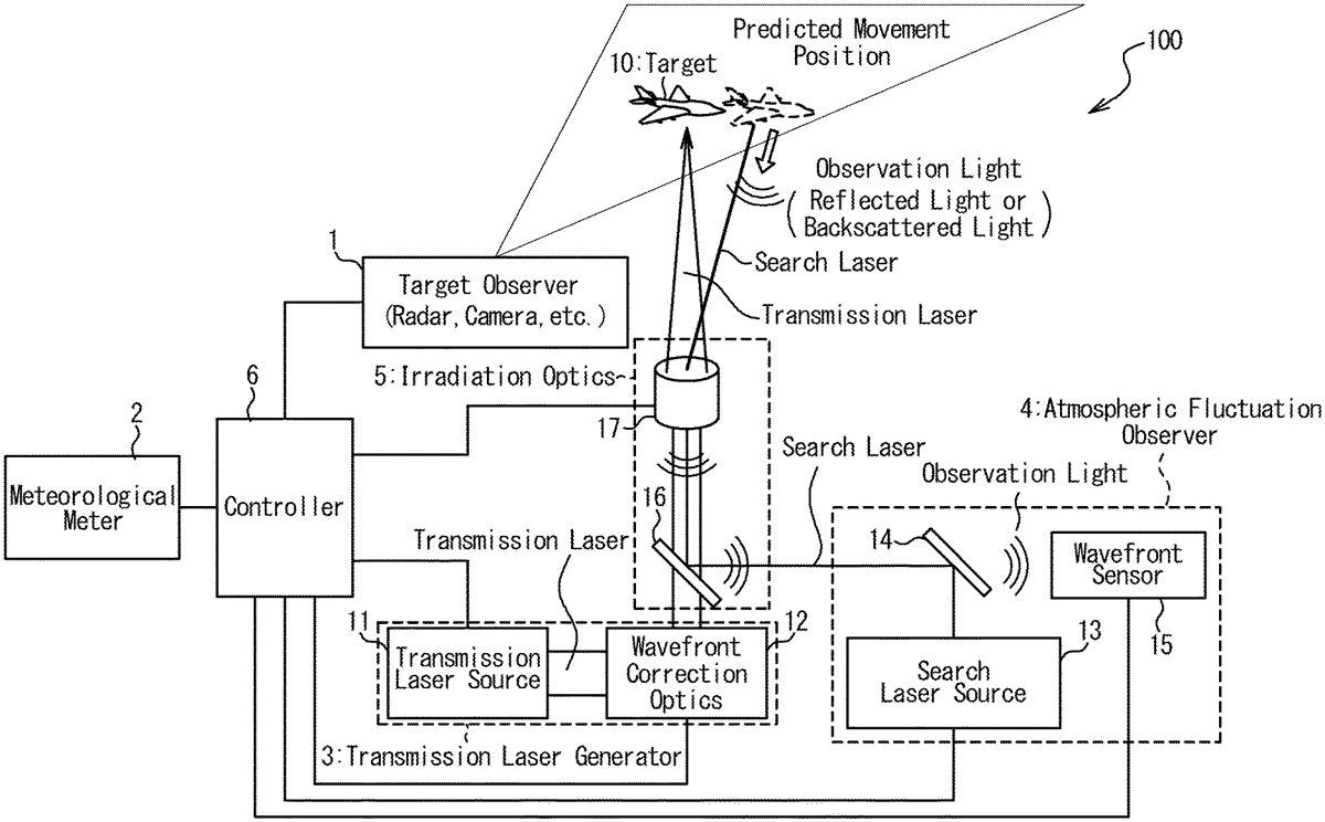 The patent describes a laser irradiation apparatus that predicts a target’s future movement and adjusts the transmission laser’s wavefront accordingly using backscattered light from a search laser. This system includes components for observing the target, calculating movement positions, and correcting the laser’s wavefront to enhance targeting accuracy.