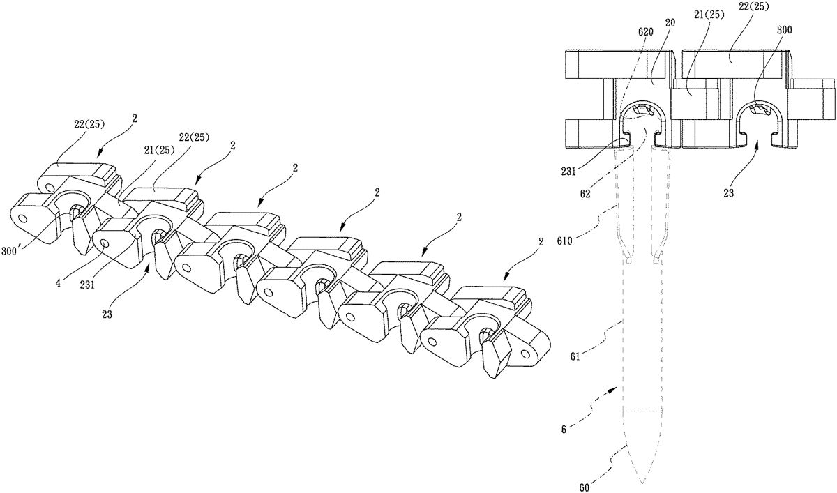 The patent describes an arrow chain structure that consists of interconnected arrow chain bodies and extension members, allowing for a pivoting connection between them. Each chain body features a base with an arrow groove and a pivoting member, facilitating the assembly of a flexible, chain-type configuration.
