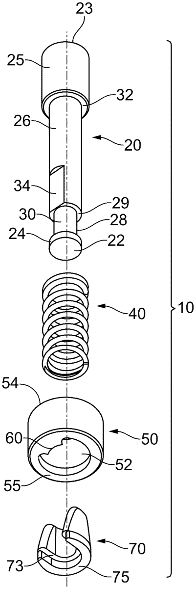 The patent describes a locking pin assembly designed for adjustable buttstocks on firearms, facilitating the extension and collapse of the buttstock in relation to the firearm’s receiver. The assembly features a unique design with a discoid head, a cap, and a coaxial stem that includes a major and minor shaft, enhancing its functionality and ease of fabrication.