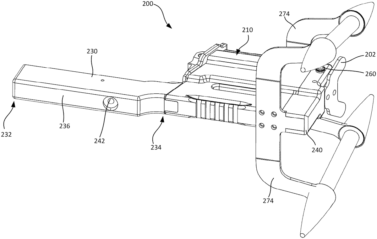 The patent describes a firearm spade grip assembly that includes a paddle trigger assembly designed to translate a trigger actuator when the paddle trigger is moved. This assembly features a base, an actuator housing, and a mechanism for engaging and pulling the firearm’s trigger in response to the paddle trigger’s movement.