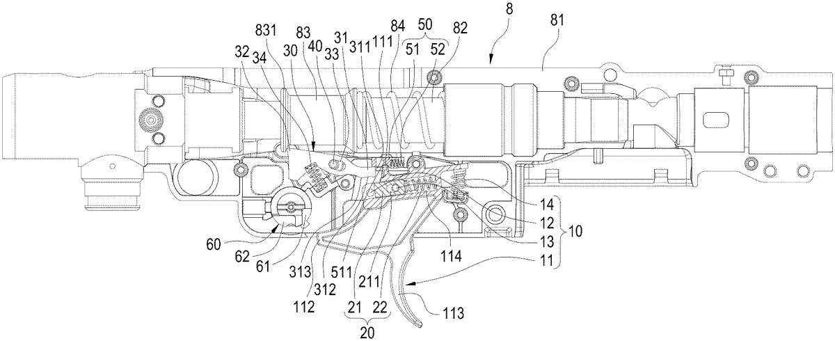 - A single-shot/repeating switching device of a toy gun, wherein the toy gun comprises a gun body and a firing cylinder, the single-shot/repeating switching device comprising: a trigger, comprising a trigger body, and the trigger body being pivoted to the gun body and comprising a pushing block and an abutting end; a trigger buffer, disposed on the trigger body, and comprising a moving block and an elastic body pushing the moving block; a release connecting plate, comprising an activating end, a fastened end and a sliding trough between the activating end and the fastened end; a positioning bar, passing the gun body and the sliding trough to position the release connecting plate; a safety blocker, corresponding to the pushing block to be disposed on the gun body; and a single-shot/repeating switching button, rotatably connected to the gun body, and comprising a repeating opening; wherein in a repeating mode, the trigger body is moved to make the abutting end enter the repeating opening, the pushing block pushes the safety blocker to move, the moving block pushes the activating end of the release connecting plate to move upward to make the fastened end escape from locking of the firing cylinder to generate a first firing, the firing cylinder touches the fastened end to make the release connecting plate rotate about the positioning bar during a return process of the firing cylinder, and the activating end is pressed by the trigger buffer to slow down a subsequent repeating speed. a trigger, comprising a trigger body, and the trigger body being pivoted to the gun body and comprising a pushing block and an abutting end; a trigger buffer, disposed on the trigger body, and comprising a moving block and an elastic body pushing the moving block; a release connecting plate, comprising an activating end, a fastened end and a sliding trough between the activating end and the fastened end; a positioning bar, passing the gun body and the sliding trough to position the release connecting plate; a safety blocker, corresponding to the pushing block to be disposed on the gun body; and a single-shot/repeating switching button, rotatably connected to the gun body, and comprising a repeating opening; wherein in a repeating mode, the trigger body is moved to make the abutting end enter the repeating opening, the pushing block pushes the safety blocker to move, the moving block pushes the activating end of the release connecting plate to move upward to make the fastened end escape from locking of the firing cylinder to generate a first firing, the firing cylinder touches the fastened end to make the release connecting plate rotate about the positioning bar during a return process of the firing cylinder, and the activating end is pressed by the trigger buffer to slow down a subsequent repeating speed.
