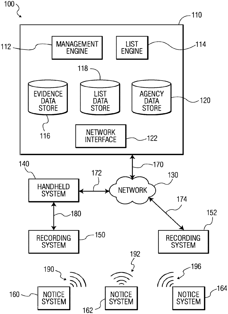 - A notice system for transmitting messages to one or more provided recording systems, the notice system comprising: one or more sensors for detecting a respective physical property of an object or a portion of the object, wherein each sensor provides data responsive to detecting the respective physical property, and wherein the physical property relates to a respective active state and a respective inactive state; a processing circuit that receives the data from each sensor of the one or more sensors; a computer-readable storage medium that stores a first session identifier; and a short-range wireless interface, wherein the processing circuit is configured to perform operations comprising: setting, by the processing circuit, a value of the first session identifier; detecting, by the processing circuit, the data from at least one sensor of the one or more sensors that reports the respective active state; and responsive to detecting the data from the at least one sensor that reports the respective active state, transmitting, by the processing circuit via the short-range wireless interface, a first message that includes the value of the first session identifier, wherein the one or more sensors, the processing circuit, the computer-readable storage medium, and the short-range wireless interface are included in a same device that transmits the first message. one or more sensors for detecting a respective physical property of an object or a portion of the object, wherein each sensor provides data responsive to detecting the respective physical property, and wherein the physical property relates to a respective active state and a respective inactive state; a processing circuit that receives the data from each sensor of the one or more sensors; a computer-readable storage medium that stores a first session identifier; and a short-range wireless interface, wherein the processing circuit is configured to perform operations comprising: setting, by the processing circuit, a value of the first session identifier; detecting, by the processing circuit, the data from at least one sensor of the one or more sensors that reports the respective active state; and responsive to detecting the data from the at least one sensor that reports the respective active state, transmitting, by the processing circuit via the short-range wireless interface, a first message that includes the value of the first session identifier, wherein the one or more sensors, the processing circuit, the computer-readable storage medium, and the short-range wireless interface are included in a same device that transmits the first message. setting, by the processing circuit, a value of the first session identifier; detecting, by the processing circuit, the data from at least one sensor of the one or more sensors that reports the respective active state; and responsive to detecting the data from the at least one sensor that reports the respective active state, transmitting, by the processing circuit via the short-range wireless interface, a first message that includes the value of the first session identifier, wherein the one or more sensors, the processing circuit, the computer-readable storage medium, and the short-range wireless interface are included in a same device that transmits the first message.