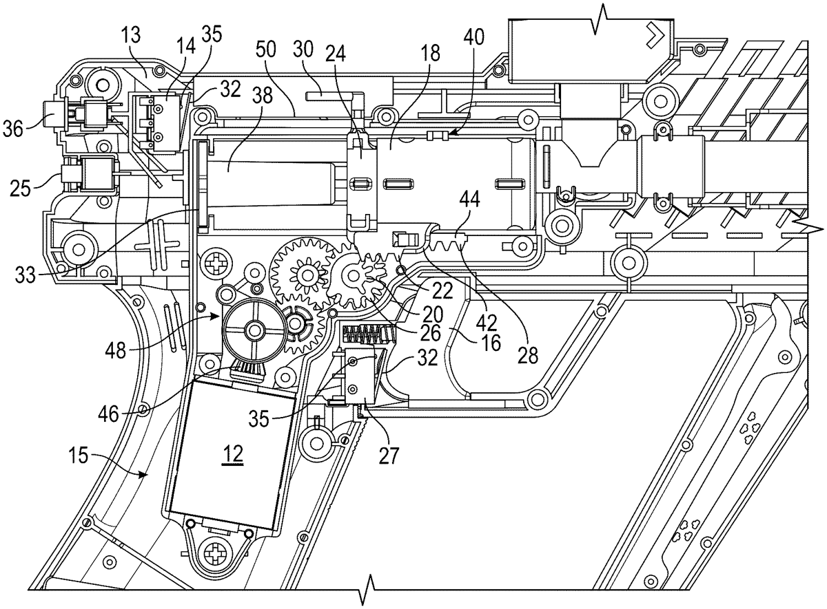 - A toy projectile shooter comprising: a housing defining a housing interior, a barrel, a trigger, wherein the trigger is movable between a non-firing position and a firing position, a firing motor, a plunger sensor, wherein when the plunger sensor is actuated the plunger sensor is configured to transmit a shot fired signal, a plunger disposed in the housing interior, and a shot firing mode system that includes at least a multi-shot mode and an auto-shot mode, wherein in the multi-shot mode the shot firing mode system is configured to activate the firing motor when the trigger is moved from the non-firing position to the firing position, move the plunger from a first plunger position to a second plunger position when the firing motor is activated, actuate the plunger sensor when the plunger is moved from the first plunger position to the second plunger position, bias the plunger from the second plunger position to the first plunger position to fire a projectile, and deactivate the firing motor after the plunger sensor has been actuated a predetermined number of times, wherein in the auto-shot mode the shot firing mode system is configured to deactivate the firing motor when the trigger is moved from the firing position to the non-firing position, and wherein in the auto-shot mode the shot firing mode system is configured to ignore the shot fired signals. a housing defining a housing interior, a barrel, a trigger, wherein the trigger is movable between a non-firing position and a firing position, a firing motor, a plunger sensor, wherein when the plunger sensor is actuated the plunger sensor is configured to transmit a shot fired signal, a plunger disposed in the housing interior, and a shot firing mode system that includes at least a multi-shot mode and an auto-shot mode, wherein in the multi-shot mode the shot firing mode system is configured to activate the firing motor when the trigger is moved from the non-firing position to the firing position, move the plunger from a first plunger position to a second plunger position when the firing motor is activated, actuate the plunger sensor when the plunger is moved from the first plunger position to the second plunger position, bias the plunger from the second plunger position to the first plunger position to fire a projectile, and deactivate the firing motor after the plunger sensor has been actuated a predetermined number of times, wherein in the auto-shot mode the shot firing mode system is configured to deactivate the firing motor when the trigger is moved from the firing position to the non-firing position, and wherein in the auto-shot mode the shot firing mode system is configured to ignore the shot fired signals. activate the firing motor when the trigger is moved from the non-firing position to the firing position, move the plunger from a first plunger position to a second plunger position when the firing motor is activated, actuate the plunger sensor when the plunger is moved from the first plunger position to the second plunger position, bias the plunger from the second plunger position to the first plunger position to fire a projectile, and deactivate the firing motor after the plunger sensor has been actuated a predetermined number of times, wherein in the auto-shot mode the shot firing mode system is configured to deactivate the firing motor when the trigger is moved from the firing position to the non-firing position, and wherein in the auto-shot mode the shot firing mode system is configured to ignore the shot fired signals.