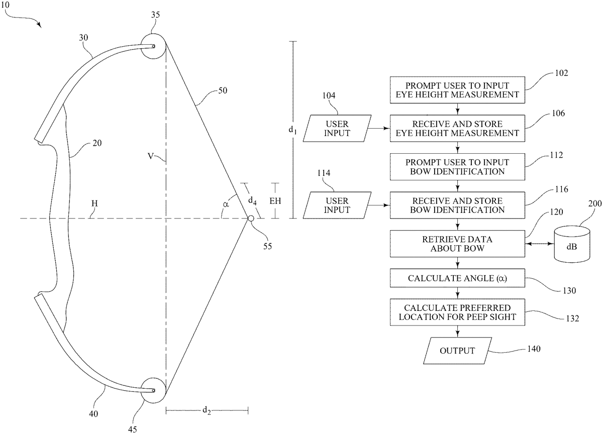 - A method for determining a preferred location for a peep sight on a compound bow, comprising steps of: providing a processor programmed to execute instructions stored in a memory component; providing a user interface in communication with the processor; prompting a user, via the user interface, and according to instructions programmed into and executed by the processor, to input an eye height measurement; receiving, via the user interface, the eye height measurement; prompting the user, via the user interface, and according to instructions programmed into and executed by the processor, to input an identification of the compound bow; receiving, via the user interface, the identification of the compound bow; using the processor, according to instructions programmed into and executed by the processor, to retrieve (a) a cam-to-arrow distance and (b) a right-to-D-loop distance from a database based on the identification of the compound bow; and using the processor, according to instructions programmed into and executed by the processor, to calculate the preferred location for the peep sight based on the eye height measurement, the cam-to-arrow distance of the compound bow, and the right-to-D-loop distance of the compound bow; wherein a vertical reference line extends from (i) a first point of contact between an upper cam and a bowstring of the compound bow, and (ii) a second point of contact between a lower cam and the bowstring of the compound bow, when the compound bow is in a drawn position; wherein a horizontal reference line is representative of an arrow in the compound bow in the drawn position; wherein the cam-to-arrow distance is a measurement of a vertical distance between (i) the first point of contact and (ii) the horizontal reference line; and wherein the right-to-D-loop distance is a measurement of a horizontal distance between (i) an intersection of the vertical reference line and the horizontal reference line and (ii) a D-loop of the bowstring in the drawn position. providing a processor programmed to execute instructions stored in a memory component; providing a user interface in communication with the processor; prompting a user, via the user interface, and according to instructions programmed into and executed by the processor, to input an eye height measurement; receiving, via the user interface, the eye height measurement; prompting the user, via the user interface, and according to instructions programmed into and executed by the processor, to input an identification of the compound bow; receiving, via the user interface, the identification of the compound bow; using the processor, according to instructions programmed into and executed by the processor, to retrieve (a) a cam-to-arrow distance and (b) a right-to-D-loop distance from a database based on the identification of the compound bow; and using the processor, according to instructions programmed into and executed by the processor, to calculate the preferred location for the peep sight based on the eye height measurement, the cam-to-arrow distance of the compound bow, and the right-to-D-loop distance of the compound bow; wherein a vertical reference line extends from (i) a first point of contact between an upper cam and a bowstring of the compound bow, and (ii) a second point of contact between a lower cam and the bowstring of the compound bow, when the compound bow is in a drawn position; wherein a horizontal reference line is representative of an arrow in the compound bow in the drawn position; wherein the cam-to-arrow distance is a measurement of a vertical distance between (i) the first point of contact and (ii) the horizontal reference line; and wherein the right-to-D-loop distance is a measurement of a horizontal distance between (i) an intersection of the vertical reference line and the horizontal reference line and (ii) a D-loop of the bowstring in the drawn position.