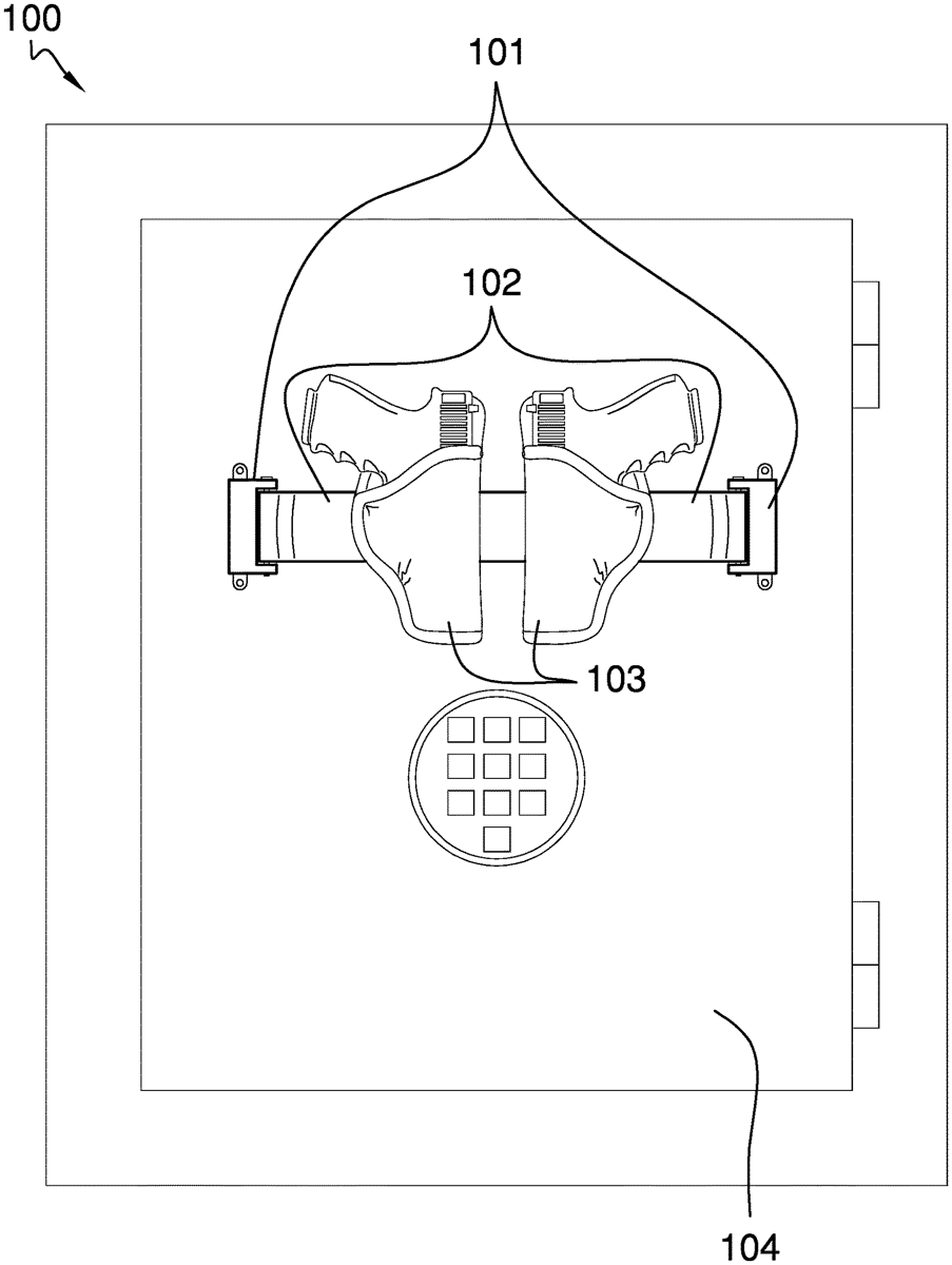 - A holster-mounting system comprising wherein the holster-mounting system comprises a plurality of mounting structures, a plurality of securing structures, and a holster structure; wherein the plurality of mounting structures secures any securing structure selected from the plurality of securing structures to a mounting surface; wherein any securing structure selected from the plurality of securing structures secures the holster structure to the plurality of mounting structures; wherein the holster structure is adapted to receive and secure a tool to the holster-mounting system; wherein the plurality of mounting structures comprises a first mounting plate and a second mounting plate; wherein the first mounting plate comprises a first mounting disk, a first plurality of mounting nuts, and a first pivot shaft; wherein the first mounting disk magnetically attaches to the mounting surface; wherein the first pivot shaft forms an anchor point that a securing structure selected from the plurality of securing structures attaches to; wherein the first pivot shaft forms an axis of rotation that allows the selected securing structure that attaches to the first pivot shaft to rotate around the first pivot shaft. wherein the holster-mounting system comprises a plurality of mounting structures, a plurality of securing structures, and a holster structure; wherein the plurality of mounting structures secures any securing structure selected from the plurality of securing structures to a mounting surface; wherein any securing structure selected from the plurality of securing structures secures the holster structure to the plurality of mounting structures; wherein the holster structure is adapted to receive and secure a tool to the holster-mounting system; wherein the plurality of mounting structures comprises a first mounting plate and a second mounting plate; wherein the first mounting plate comprises a first mounting disk, a first plurality of mounting nuts, and a first pivot shaft; wherein the first mounting disk magnetically attaches to the mounting surface; wherein the first pivot shaft forms an anchor point that a securing structure selected from the plurality of securing structures attaches to; wherein the first pivot shaft forms an axis of rotation that allows the selected securing structure that attaches to the first pivot shaft to rotate around the first pivot shaft.