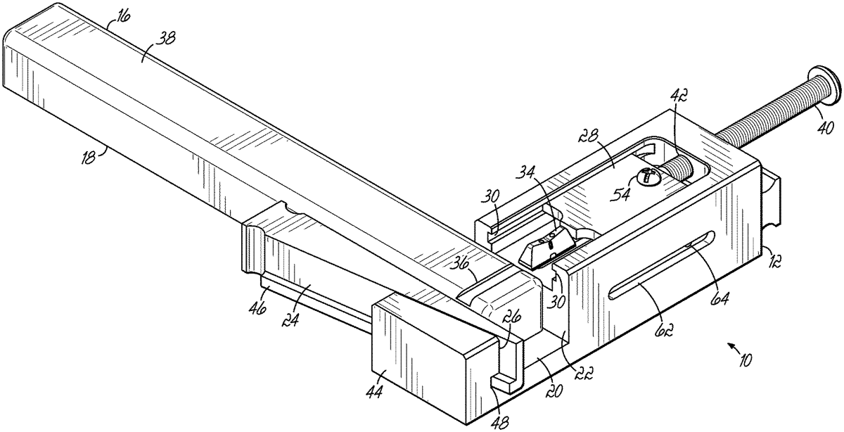 The patent describes a sight installation tool designed for pistol slides, featuring a body with a notch to accommodate the slide and a guide channel for a pusher bit that aligns with the sight receiving groove. It includes a drive screw mechanism that facilitates the installation of the sight element by pushing it into place without obstruction above the groove.