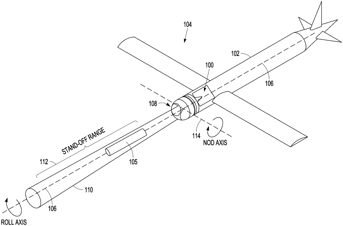 This patent describes a dual-mode roll/nod gimballed seeker designed to ensure an unobstructed path for a forming warhead’s penetrator during detonation. The system utilizes a nod assembly with two offset seekers that overlap in their fields of view, allowing for precise targeting while saving space in small diameter warheads.