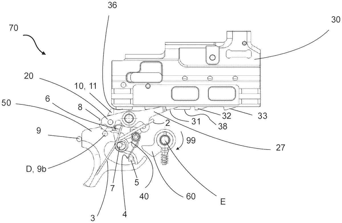 The patent describes a control element for an automatic weapon that includes a trigger assembly designed to pivot and interact with a breechblock stop lever and carrier. This assembly allows for precise control of the breechblock’s position through a series of interconnected components, enhancing the weapon’s functionality.