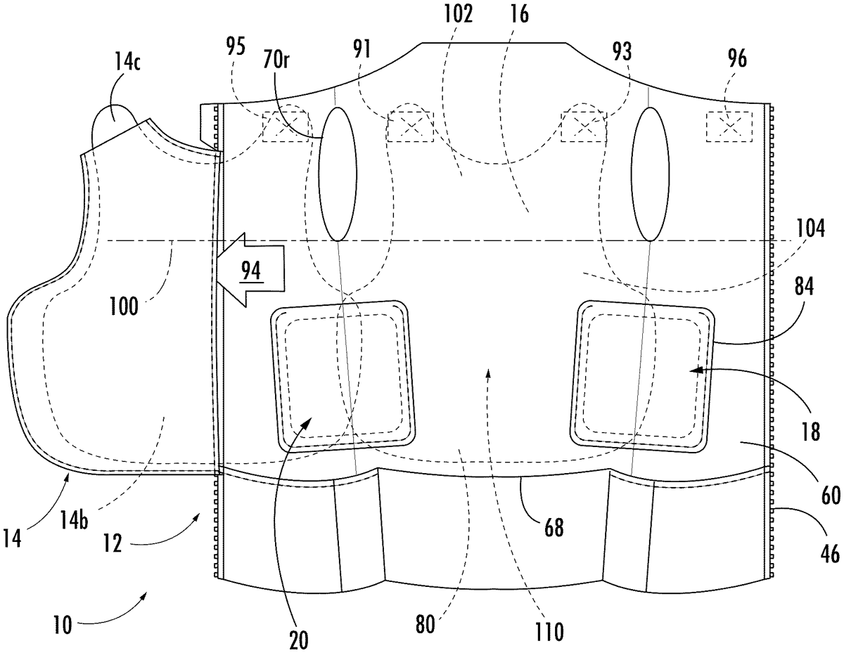 The patent describes a ballistic vest featuring a carrier with an inner and outer layer that creates a panel space for ballistic panels, allowing for flexibility and movement. The design includes a front zipper and a flap pocket for secure placement of the front panel sections, enhancing comfort and protection for the wearer.