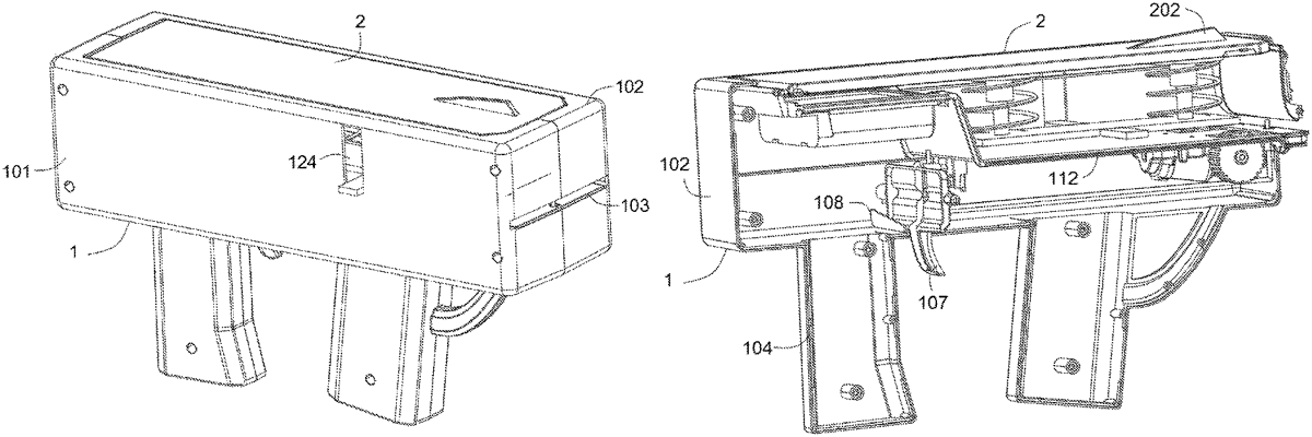 The patent describes a planar ejector featuring an ejecting mechanism with a motor that enhances the efficiency of the ejecting process by utilizing dual eject gears. This design includes a compress mechanism and various handles and plates to facilitate operation and improve the ejector’s capacity.