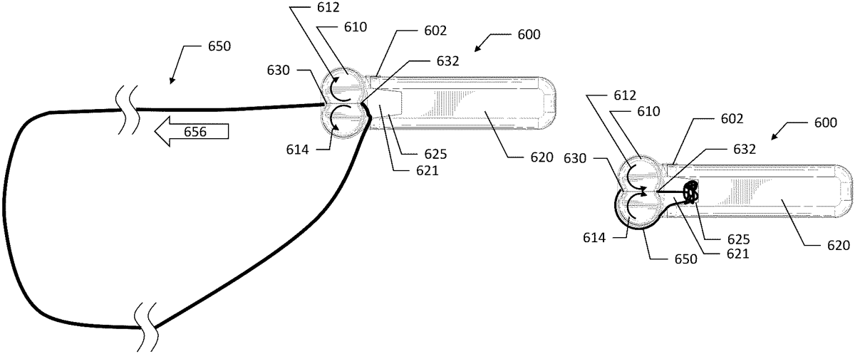 The patent describes a wearable string shooting device that is activated by specific body movements, allowing the user to propel or retrieve a looped string. It features a pair of wheels, one of which is driven, and an actuator that controls the direction of the wheel’s rotation to either launch the string or draw it back into a storage cavity.