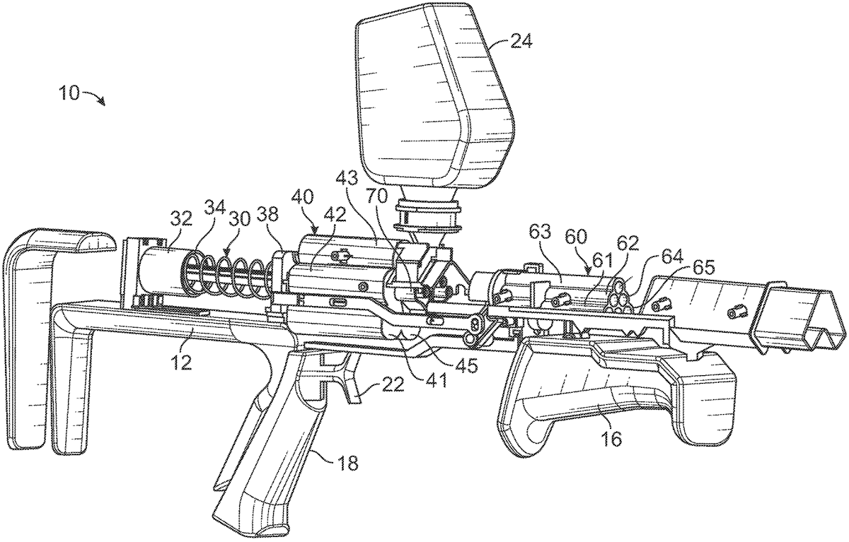 - A toy launching apparatus, comprising: a housing; at least one barrel mounted to the housing; a funnel in the housing for interfacing to a hopper for storing a multiplicity of projectile rounds; an energy source at the housing for launching one or more projectile rounds of the multiplicity, the energy source including a single launch spring for moving at least one piston within one or more cylinders; a pressure distributor operatively coupling with each of the one or more cylinders forward the at least one piston; an alignment system for receiving a predetermined plural number of the projectile rounds of the multiplicity, for aligning individual projectile rounds of the predetermined plural number of the projectile rounds between the pressure distributor and the at least one barrel, said alignment system comprising a staging conduit for receiving the predetermined plural number of the projectile rounds, with the pressure distributor coupling each of the one or more cylinders with a respective one of the individual projectile rounds, for launching the predetermined plural number of projectile rounds; and an actuator mounted to the housing and linked to the energy source for causing the single launch spring of the energy source to move the at least one piston and launch the individual projectile rounds through the at least one barrel. a housing; at least one barrel mounted to the housing; a funnel in the housing for interfacing to a hopper for storing a multiplicity of projectile rounds; an energy source at the housing for launching one or more projectile rounds of the multiplicity, the energy source including a single launch spring for moving at least one piston within one or more cylinders; a pressure distributor operatively coupling with each of the one or more cylinders forward the at least one piston; an alignment system for receiving a predetermined plural number of the projectile rounds of the multiplicity, for aligning individual projectile rounds of the predetermined plural number of the projectile rounds between the pressure distributor and the at least one barrel, said alignment system comprising a staging conduit for receiving the predetermined plural number of the projectile rounds, with the pressure distributor coupling each of the one or more cylinders with a respective one of the individual projectile rounds, for launching the predetermined plural number of projectile rounds; and an actuator mounted to the housing and linked to the energy source for causing the single launch spring of the energy source to move the at least one piston and launch the individual projectile rounds through the at least one barrel.