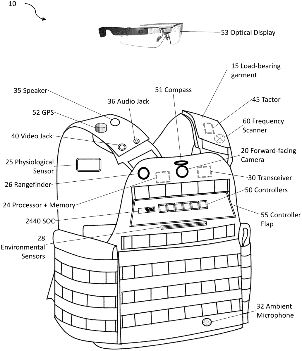 The patent describes a personal tactical system that integrates a load-bearing garment with a camera, power distribution hub, and battery pouch, allowing for enhanced functionality in tactical situations. This system can form an ad hoc network to share images and information regarding object direction, location, and movement among multiple users.