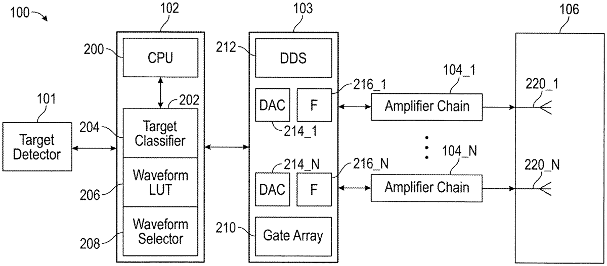 - A system configured to emit electromagnetic radiation, the system comprising: a hardware computing sub-system; a programmable radio frequency (RF) generator configured to be controlled by the hardware computing sub-system, the RF generator configured to generate an RF signal having a central frequency in a range from about 1 MHz and to about 100 GHz, the RF signal comprising a plurality of pulses having a pulse duration, a duty cycle, and a pulse amplitude; an amplifying sub-system configured to amplify the RF signal, the amplifying sub-system comprising a plurality of solid-state amplifiers; and an antenna sub-system configured to direct an electromagnetic (EM) radiation towards a target electronic system, the EM radiation configured to cause a disruptive effect in the target electronic system at a power level greater than a threshold power level, wherein the system is configured to: direct the EM radiation at a first frequency selected from a range of frequencies between a minimum frequency f min and and a maximum frequency f max ; determine an effect of the EM radiation at the first frequency on the target electronic system; and direct the EM radiation at a second frequency selected from a range of frequencies between the minimum frequency f min and the maximum frequency f max based on the determined effect, and wherein a difference between the first frequency and the second frequency is less than or equal to a threshold frequency value when the effect of the EM radiation at the first frequency on the target electronic system comprises a change in a state of the target electronic system. a hardware computing sub-system; a programmable radio frequency (RF) generator configured to be controlled by the hardware computing sub-system, the RF generator configured to generate an RF signal having a central frequency in a range from about 1 MHz and to about 100 GHz, the RF signal comprising a plurality of pulses having a pulse duration, a duty cycle, and a pulse amplitude; an amplifying sub-system configured to amplify the RF signal, the amplifying sub-system comprising a plurality of solid-state amplifiers; and an antenna sub-system configured to direct an electromagnetic (EM) radiation towards a target electronic system, the EM radiation configured to cause a disruptive effect in the target electronic system at a power level greater than a threshold power level, wherein the system is configured to: direct the EM radiation at a first frequency selected from a range of frequencies between a minimum frequency f min and and a maximum frequency f max ; determine an effect of the EM radiation at the first frequency on the target electronic system; and direct the EM radiation at a second frequency selected from a range of frequencies between the minimum frequency f min and the maximum frequency f max based on the determined effect, and direct the EM radiation at a first frequency selected from a range of frequencies between a minimum frequency f min and and a maximum frequency f max ; determine an effect of the EM radiation at the first frequency on the target electronic system; and direct the EM radiation at a second frequency selected from a range of frequencies between the minimum frequency f min and the maximum frequency f max based on the determined effect, and wherein a difference between the first frequency and the second frequency is less than or equal to a threshold frequency value when the effect of the EM radiation at the first frequency on the target electronic system comprises a change in a state of the target electronic system.
