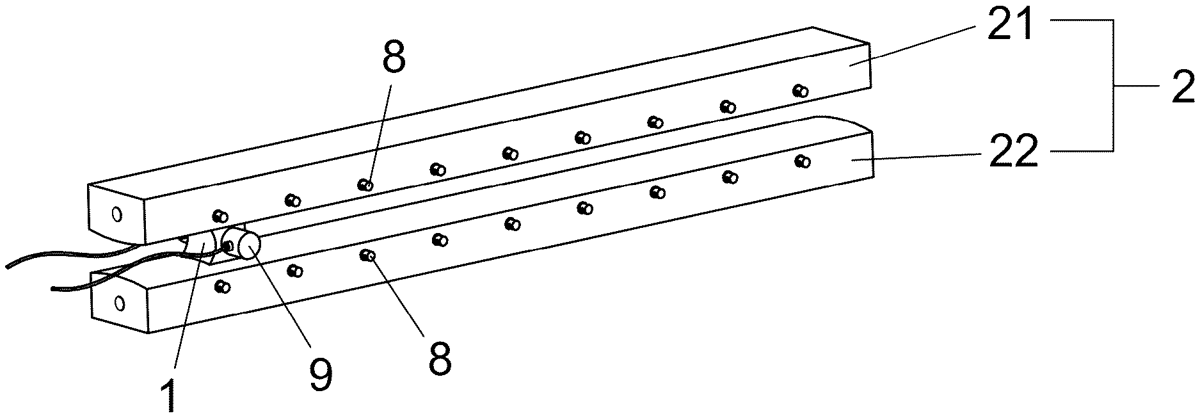 - A dynamic acoustic emission in-situ testing device for an electromagnetic rail launcher, comprising an armature, a guide rail, a support base, bolts, an optical imaging module, an infrared imaging module, static acoustic emission sensors, dynamic acoustic emission sensors and a control module, wherein the support base comprises an upper support base and a lower support base, the upper support base is arranged right above the lower support base at an interval, and a plurality of groups of bolts which are connected to the upper support base and the lower support base are arranged therebetween, so that a distance between the upper support base and the lower support base can be adjusted through the bolts; the guide rail comprises a strip-shaped upper guide rail and a strip-shaped lower guide rail arranged at an interval, the upper guide rail is arranged on the upper support base, the lower guide rail is arranged on the lower support base, the upper guide rail and the lower guide rail are kept parallel on a vertical plane, a plurality of groups of static acoustic emission sensors distributed along the upper guide rail are detachably arranged on the upper guide rail at intervals, and a plurality of groups of static acoustic emission sensors distributed along the lower guide rail are detachably arranged on the lower guide rail at intervals, wherein the static acoustic emission sensors are distributed along two sides of the upper guide rail and the lower guide rail; the armature is arranged on the guide rail, the armature contacts the upper guide rail and the lower guide rail, so that the armature and the guide rail can form a conductive path, the armature can slide along the guide rail, and the armature is detachably provided with the dynamic acoustic emission sensors, wherein the armature is saddle-shaped, and a top surface and a bottom surface of which are parallel to each other and contact the upper guide rail and the lower guide rail respectively; the dynamic acoustic emission sensors are arranged on two sides of the armature; the support base is externally provided with the optical imaging module configured to obtain optical imaging of an area where the armature and the guide rail are located and the infrared imaging module configured to obtain infrared imaging of an area where the armature and the guide rail are located; and the support base is also externally provided with the control module, the control module is in communication connection with the guide rail, the optical imaging module, the infrared imaging module, the static acoustic emission sensors and the dynamic acoustic emission sensors. the guide rail comprises a strip-shaped upper guide rail and a strip-shaped lower guide rail arranged at an interval, the upper guide rail is arranged on the upper support base, the lower guide rail is arranged on the lower support base, the upper guide rail and the lower guide rail are kept parallel on a vertical plane, a plurality of groups of static acoustic emission sensors distributed along the upper guide rail are detachably arranged on the upper guide rail at intervals, and a plurality of groups of static acoustic emission sensors distributed along the lower guide rail are detachably arranged on the lower guide rail at intervals, wherein the static acoustic emission sensors are distributed along two sides of the upper guide rail and the lower guide rail; the armature is arranged on the guide rail, the armature contacts the upper guide rail and the lower guide rail, so that the armature and the guide rail can form a conductive path, the armature can slide along the guide rail, and the armature is detachably provided with the dynamic acoustic emission sensors, wherein the armature is saddle-shaped, and a top surface and a bottom surface of which are parallel to each other and contact the upper guide rail and the lower guide rail respectively; the dynamic acoustic emission sensors are arranged on two sides of the armature; the support base is externally provided with the optical imaging module configured to obtain optical imaging of an area where the armature and the guide rail are located and the infrared imaging module configured to obtain infrared imaging of an area where the armature and the guide rail are located; and the support base is also externally provided with the control module, the control module is in communication connection with the guide rail, the optical imaging module, the infrared imaging module, the static acoustic emission sensors and the dynamic acoustic emission sensors.