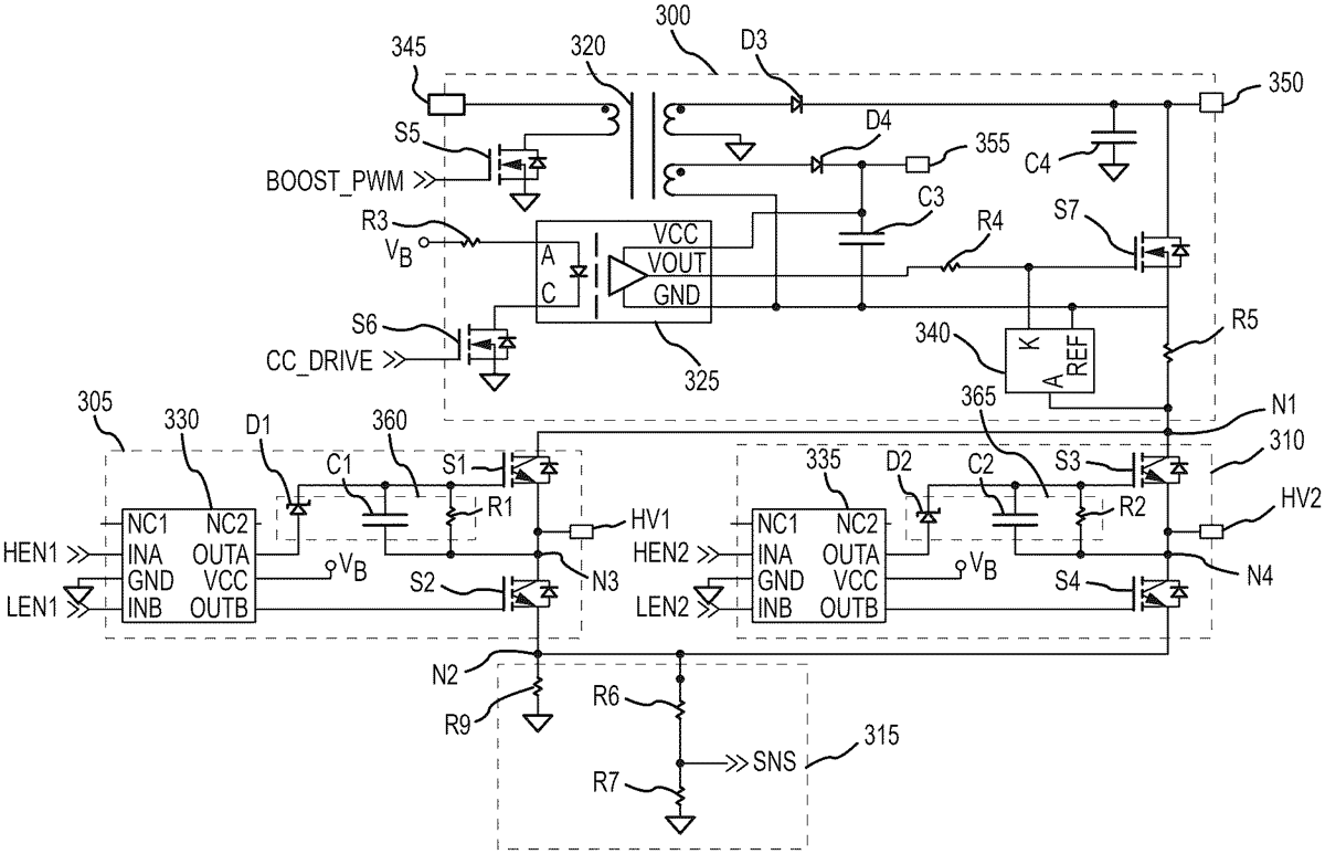 - A signal generator circuit, comprising: a current source circuit comprising one of: a charge storage device, a high-side driver module, and a transistor; a first driver circuit connected to the current source circuit at a first node and comprising: a first switch device connected in series with a second switch device at a second node; and a first charge storage device connected between the first switch device and the second switch device; and a second driver circuit connected to the current source circuit at the first node and comprising: a third switch device connected in series with a fourth switch device at a third node; and a second charge storage device connected between the third switch device and the fourth switch device, wherein when the first switch device is driven in a closed state, the first node is electrically coupled to the second node via the first switch device. a current source circuit comprising one of: a charge storage device, a high-side driver module, and a transistor; a first driver circuit connected to the current source circuit at a first node and comprising: a first switch device connected in series with a second switch device at a second node; and a first charge storage device connected between the first switch device and the second switch device; and a first switch device connected in series with a second switch device at a second node; and a first charge storage device connected between the first switch device and the second switch device; and a second driver circuit connected to the current source circuit at the first node and comprising: a third switch device connected in series with a fourth switch device at a third node; and a second charge storage device connected between the third switch device and the fourth switch device, wherein when the first switch device is driven in a closed state, the first node is electrically coupled to the second node via the first switch device. a third switch device connected in series with a fourth switch device at a third node; and a second charge storage device connected between the third switch device and the fourth switch device, wherein when the first switch device is driven in a closed state, the first node is electrically coupled to the second node via the first switch device.