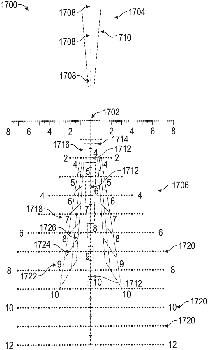 The patent describes a reticle designed for firearms that includes a crosshair, ranging section with target height chevrons, and a targeting section featuring ballistic solution chevrons, density altitude guide, and wind compensation guide. The density altitude guide consists of multiple lines indicating altitude compensation at various heights, while the wind compensation guide provides vertical dotted lines for wind adjustments at corresponding altitudes and distances.