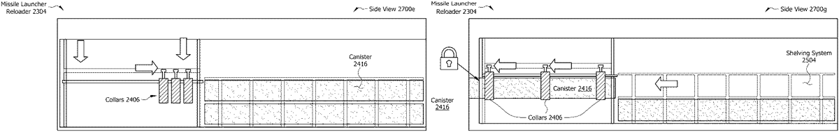 The patent describes a method for automating the reloading of missile launchers using a shelving system with collars and rollers to efficiently align and feed canisters into the launcher. This process involves several steps, including aligning collars, activating rollers, and adjusting the collars to ensure proper placement of the canister into the launcher cell.