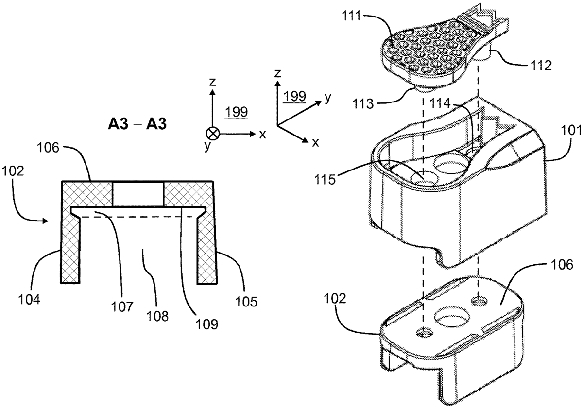 The patent describes a holder device designed to securely hold objects using a moveable carrier element that can transition between two positions, controlled by a force generating system. In the first position, a rim closes the trough to prevent movement of the objects, while in the second position, the trough allows for the longitudinal movement of objects.