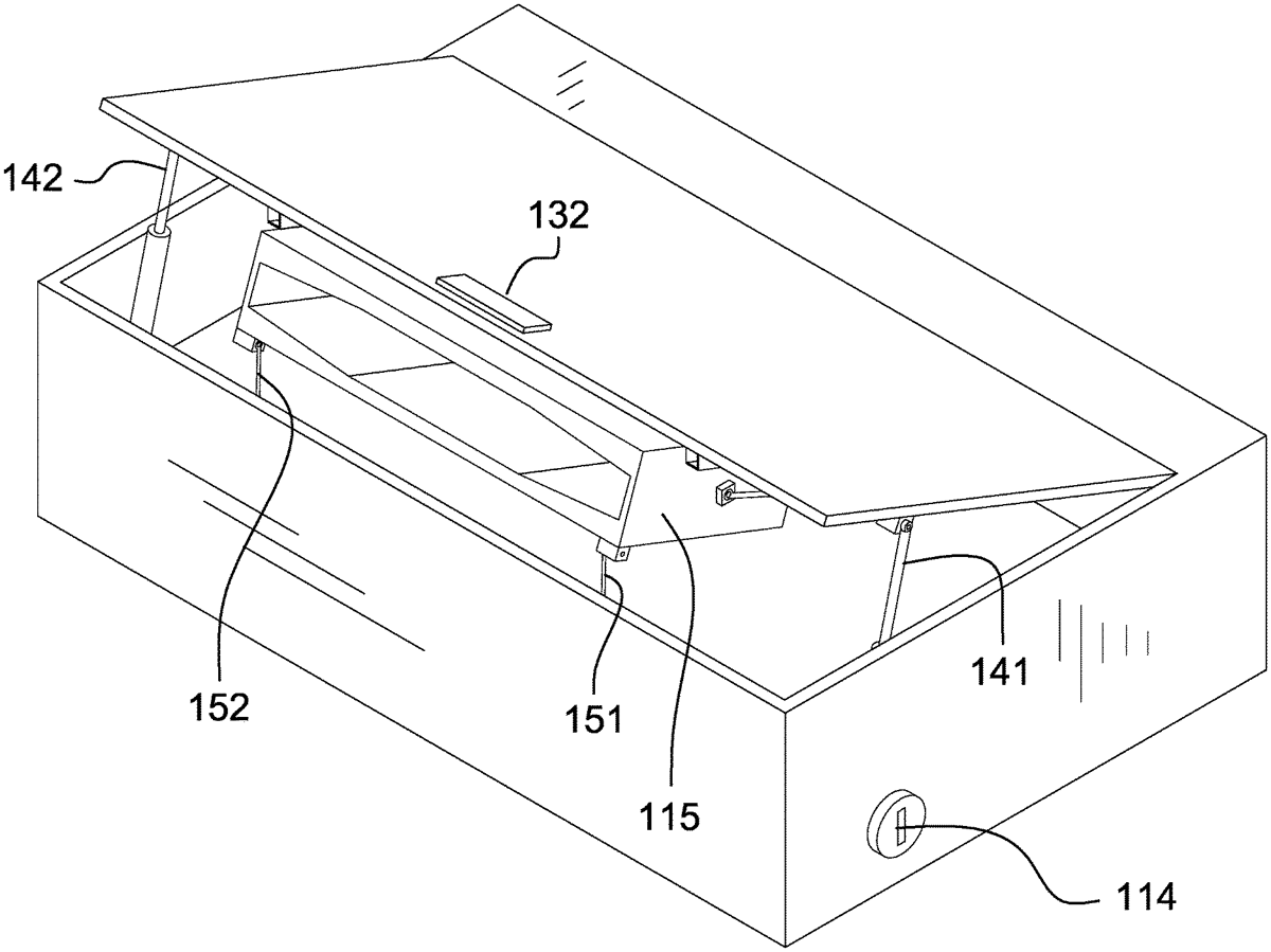 The patent describes a handgun safe that features a safe structure, shock absorber structure, and control circuit, allowing for the safe storage and rapid access to a firearm. The design enables the lid to rotate between open and closed positions, utilizing shock absorbers to smoothly present the firearm to the user while ensuring safety during operation.