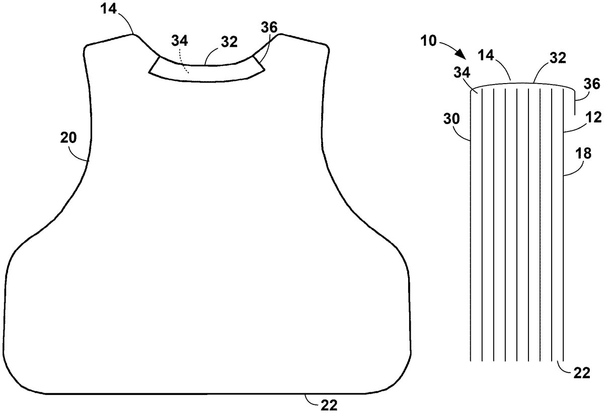 The patent describes a soft body armor panel featuring a top edge with a folded layer that creates a pocket designed to capture upwardly directed bullets, enhancing neck protection. The design allows for various configurations of the folded layers, which can be stacked or nested to optimize ballistic performance.