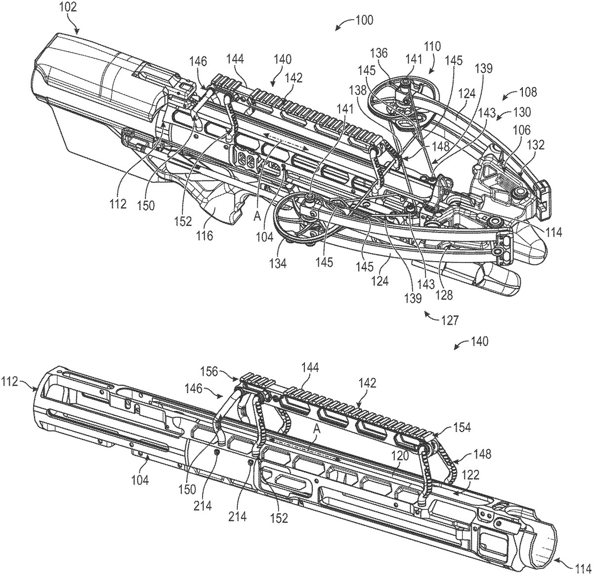 1 . A crossbow, comprising: a stock; a riser; a barrel rail coupled to the stock and the riser and defining a projectile axis; a limb assembly coupled to the riser; and a mounting rail assembly including: a mounting rail defining a first axial end and a second axial end; a first mounting bar coupled to the barrel rail and the first axial end of the mounting rail; and a second mounting bar coupled to the barrel rail and the second axial end of the mounting rail. a stock; a riser; a barrel rail coupled to the stock and the riser and defining a projectile axis; a limb assembly coupled to the riser; and a mounting rail assembly including: a mounting rail defining a first axial end and a second axial end; a first mounting bar coupled to the barrel rail and the first axial end of the mounting rail; and a second mounting bar coupled to the barrel rail and the second axial end of the mounting rail. a mounting rail defining a first axial end and a second axial end; a first mounting bar coupled to the barrel rail and the first axial end of the mounting rail; and a second mounting bar coupled to the barrel rail and the second axial end of the mounting rail.