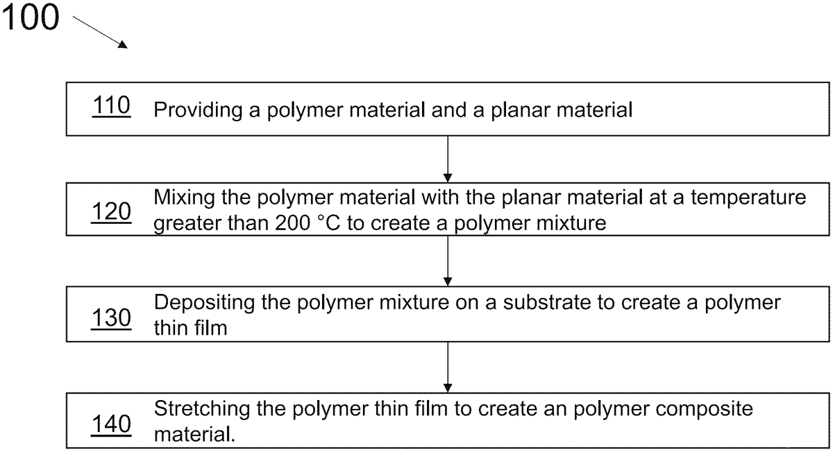 A method of fabricating a polymer composite material by mixing a polymer material with a planar material, depositing the mixture on a substrate, and stretching the resulting thin film, is described. Polymer composite materials produced using said method and ballistic resistant materials comprising said polymer composite materials are also described.
