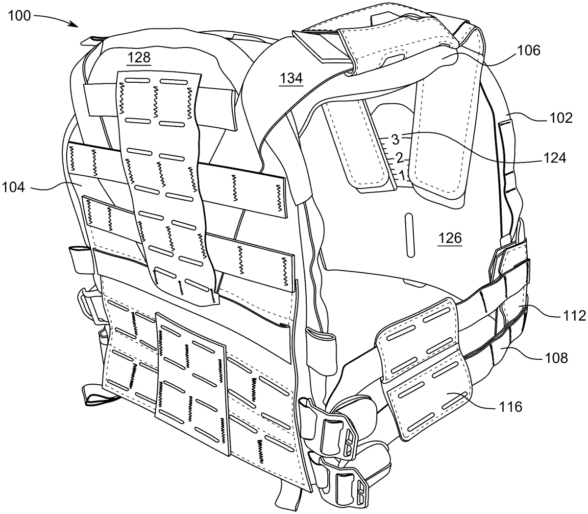 The patent describes an adjustable tactical vest system featuring independently adjustable shoulder straps that can be attached at various positions on the vest’s chest or back panels. It includes reference markings to ensure that the straps can be aligned for equivalent wearable lengths, enhancing fit and comfort for the user.